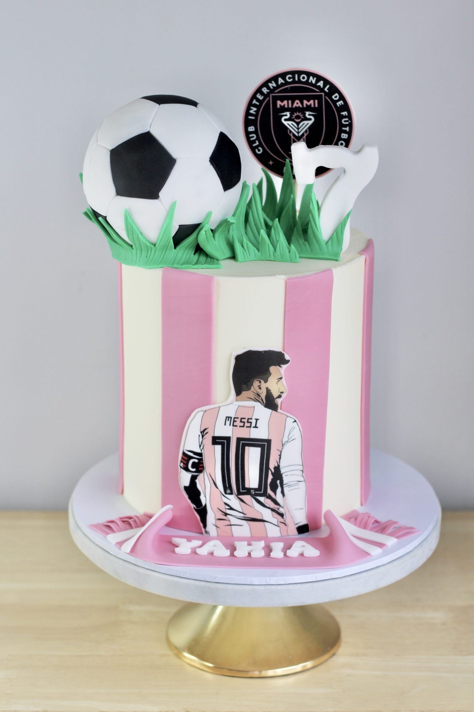 Celebrate football in style with this Inter Miami-themed cake, featuring the club’s signature pink and white stripes. A printed image of Messi in his Miami kit takes centre stage, accompanied by a fondant football topper, grass detailing, and an edible team crest. A personalised fondant scarf adds the finishing touch, making this cake a fantastic choice for any football fan. This cake can also be customised to represent any football team and player.