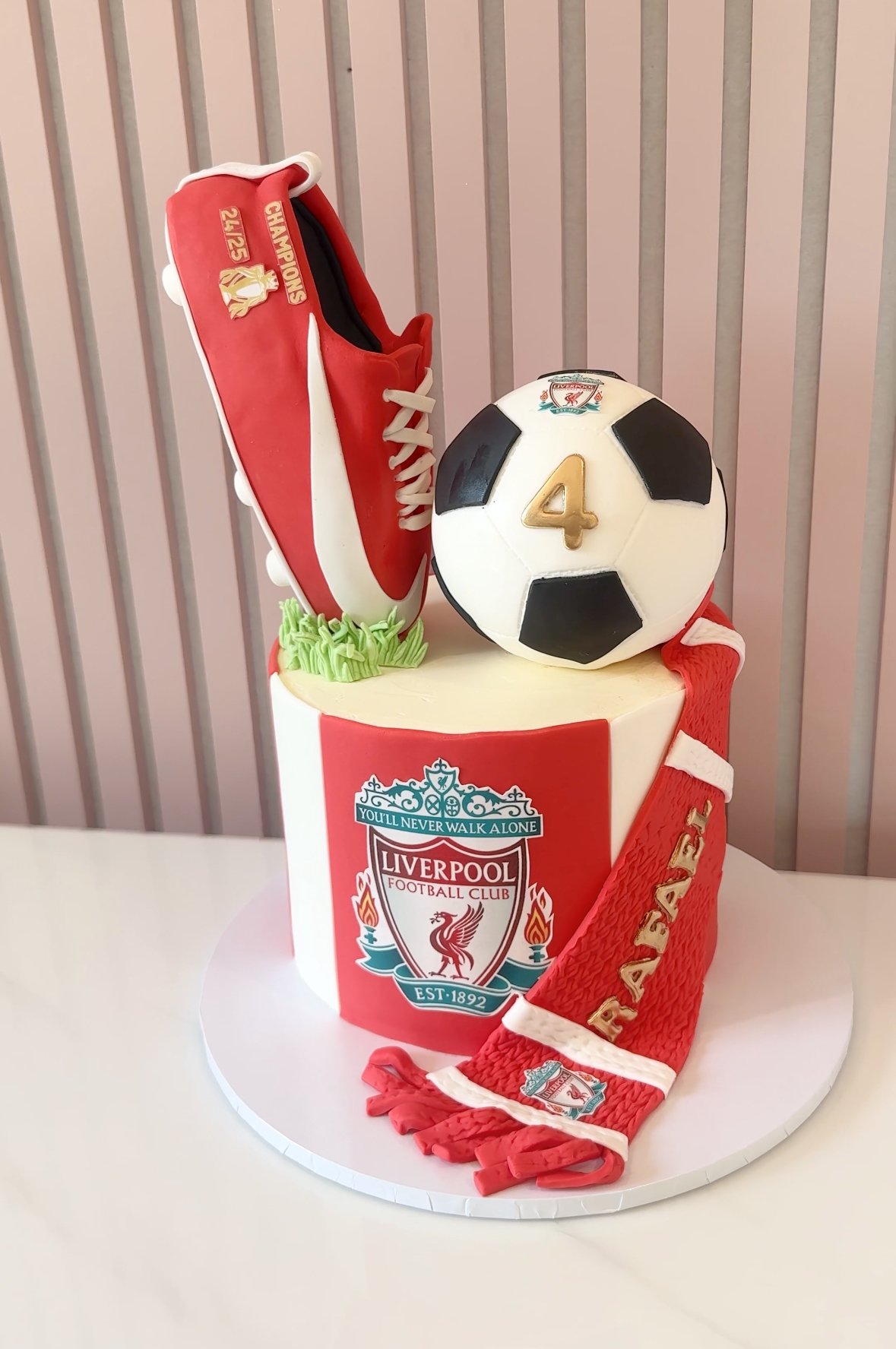 Celebrate your favourite team in style with this awesome football cake, featuring a striking edible boot, a classic football, and a custom scarf draped down the side. Topped with a “Champions 24/25” boot design, this cake is perfect for football fans of all ages and can be customised to represent any team.