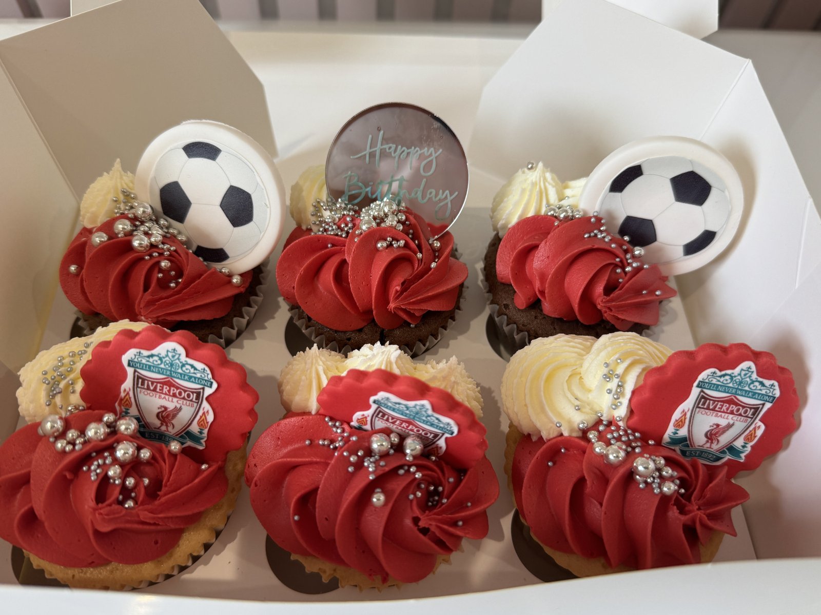 These football birthday cupcakes are finished with bold buttercream swirls and classic football-themed fondant toppers, creating a striking and celebratory look. Designed to be styled in the colours and crest of your chosen football team, they’re ideal for birthdays and football-themed celebrations of any age. Please specify your chosen team in the notes.