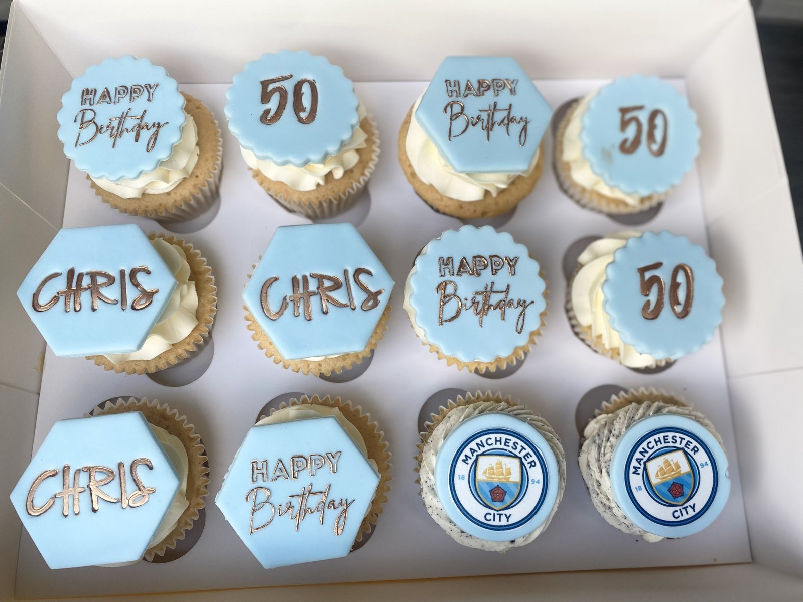 These cupcakes are finished with smooth buttercream and personalised fondant toppers, featuring names, ages, birthday messages, and football-themed designs. Ideal for birthday celebrations, they are styled to feel polished and thoughtful, with details tailored to the occasion. Colours, wording, and football teams can be customised to suit your celebration. Please specify your chosen team, name, and age in the notes.