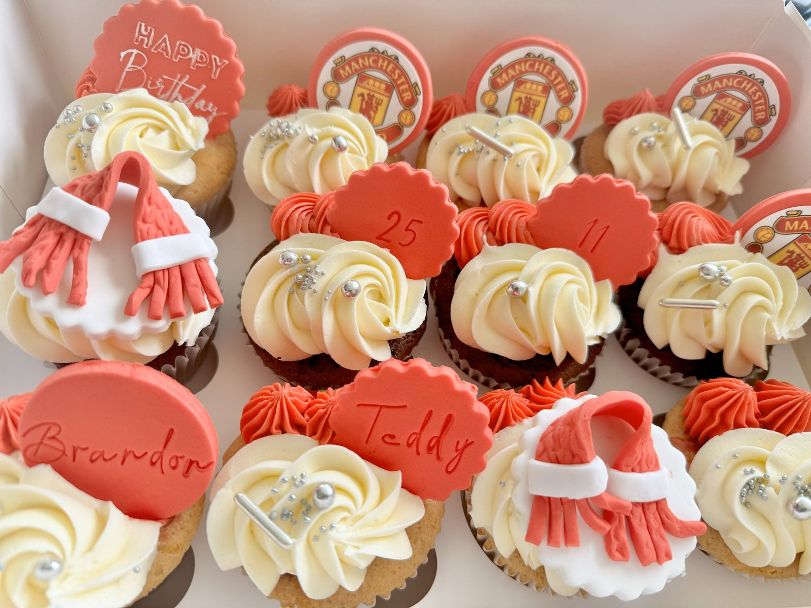 A dynamic box of football-themed cupcakes decorated with bold buttercream swirls and finished with custom edible team logo toppers and coordinated colour accents. Designed to be personalised to any club or team of your choice, these cupcakes bring sporty flair to birthdays, match days, and fan celebrations alike. Presented exactly as shown with vibrant team-colour detailing and themed edible decorations.