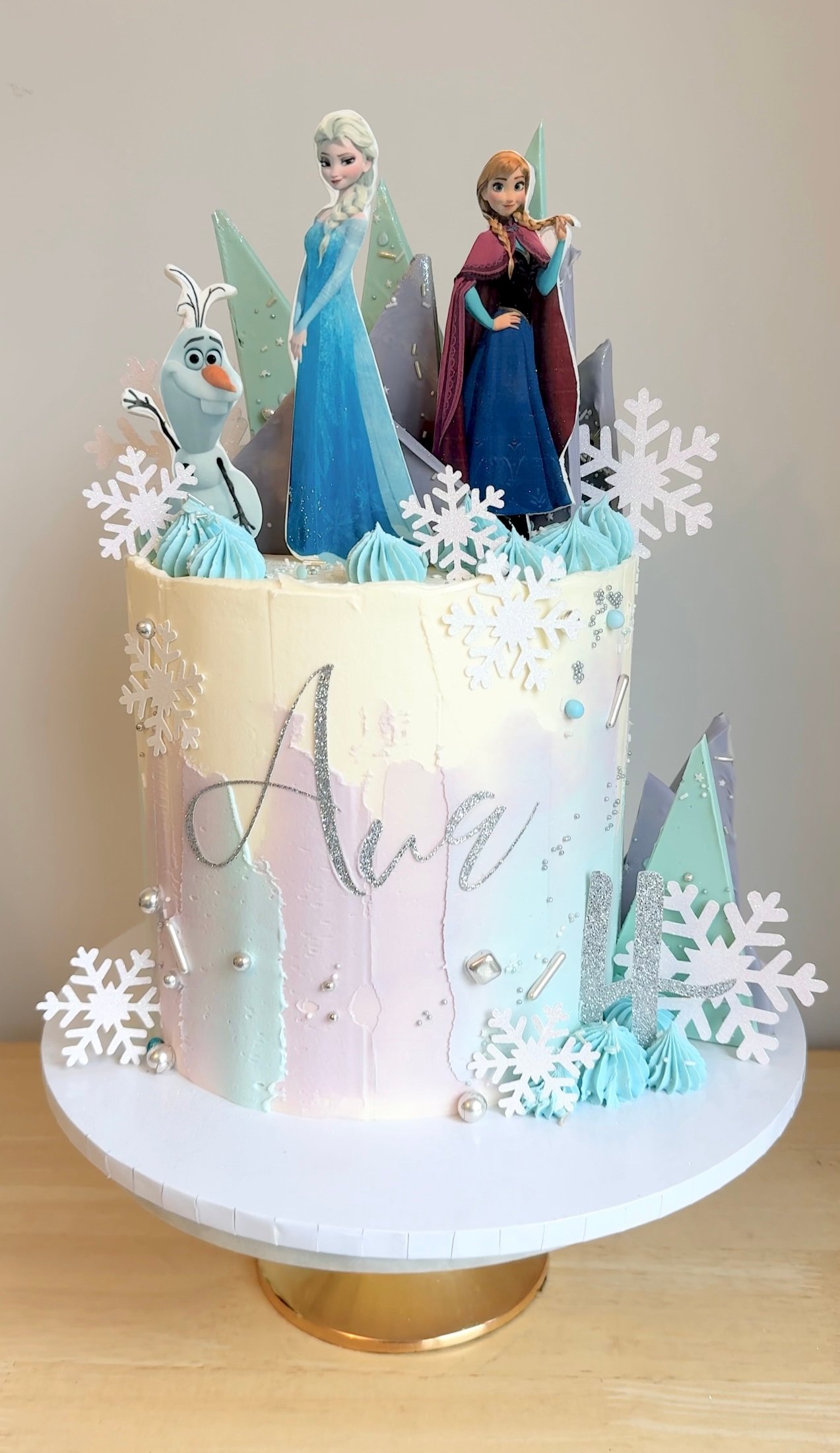 Step into a winter wonderland with this enchanting Frozen Cake! Inspired by the beloved film, this pastel-toned masterpiece features Elsa, Anna, and Olaf, surrounded by shimmering snowflakes and icy peaks. The elegant watercolour-style buttercream and frosted details make this cake the perfect centrepiece for any Frozen-themed birthday celebration.