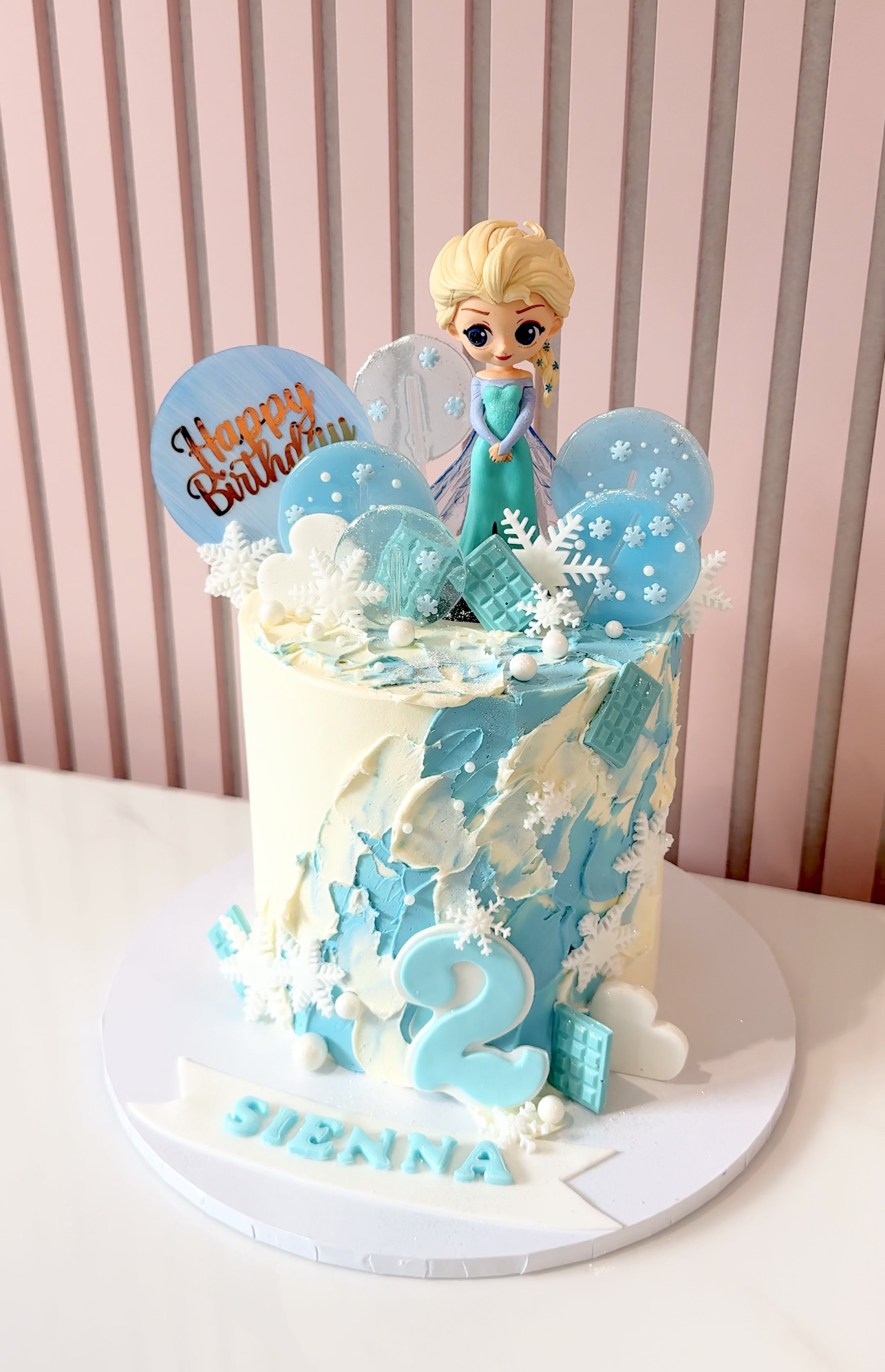 Step into a winter wonderland with this Frozen-themed birthday cake, perfect for fans of Elsa! Decorated with snowflakes, icy blue textures, and shimmering edible pearls, it features a striking Elsa figurine surrounded by frosted clouds and glacier-inspired shards. A magical centrepiece for any snowy celebration.