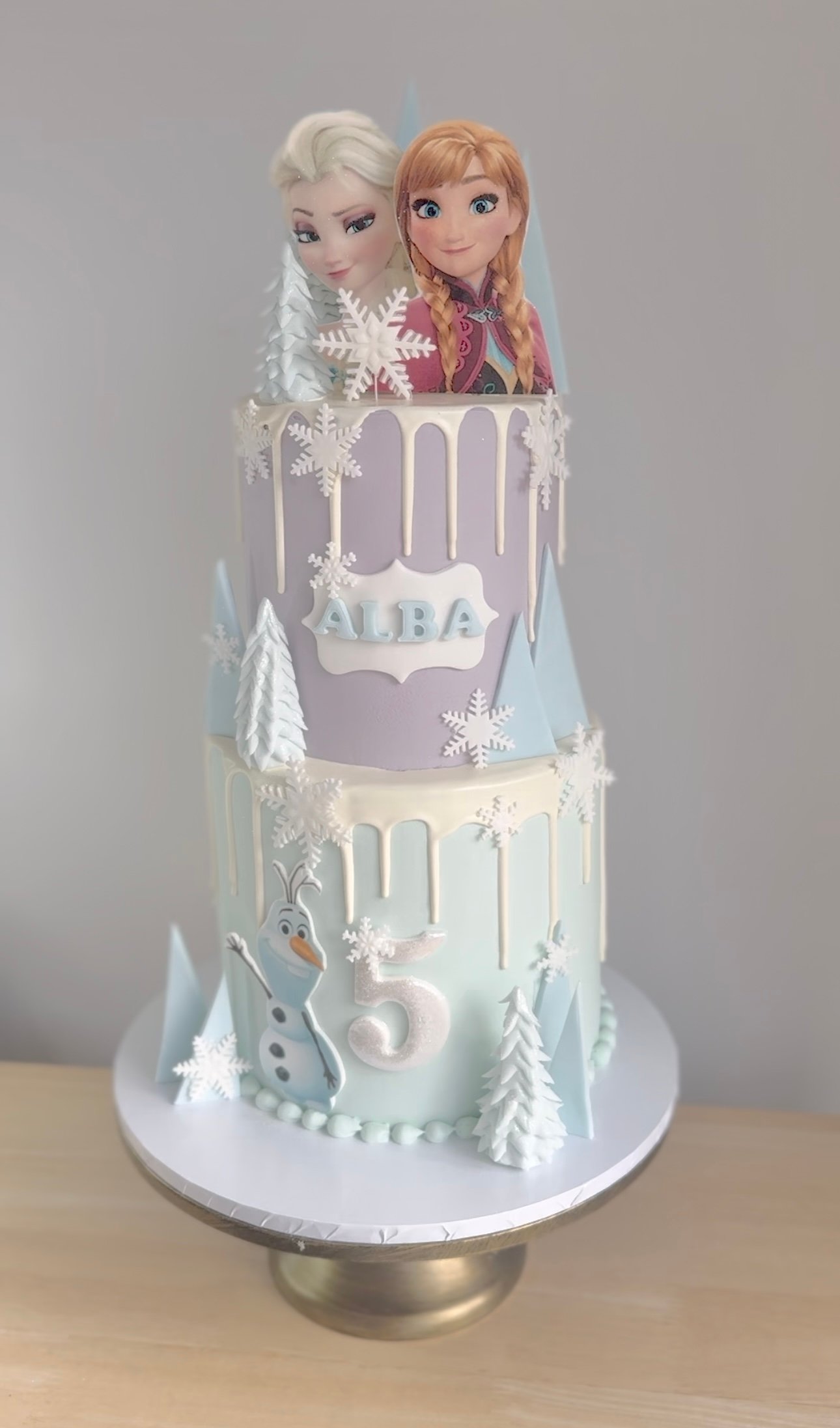 Bring the magic of Arendelle to life with this enchanting Frozen-themed cake! Featuring Elsa, Anna, and Olaf, this beautifully designed two-tier cake showcases icy blue and lavender tones, delicate snowflakes, and elegant white drips resembling frosted icicles. Complete with edible winter trees and shimmering details, it’s the perfect centrepiece for any Frozen fan’s birthday celebration.