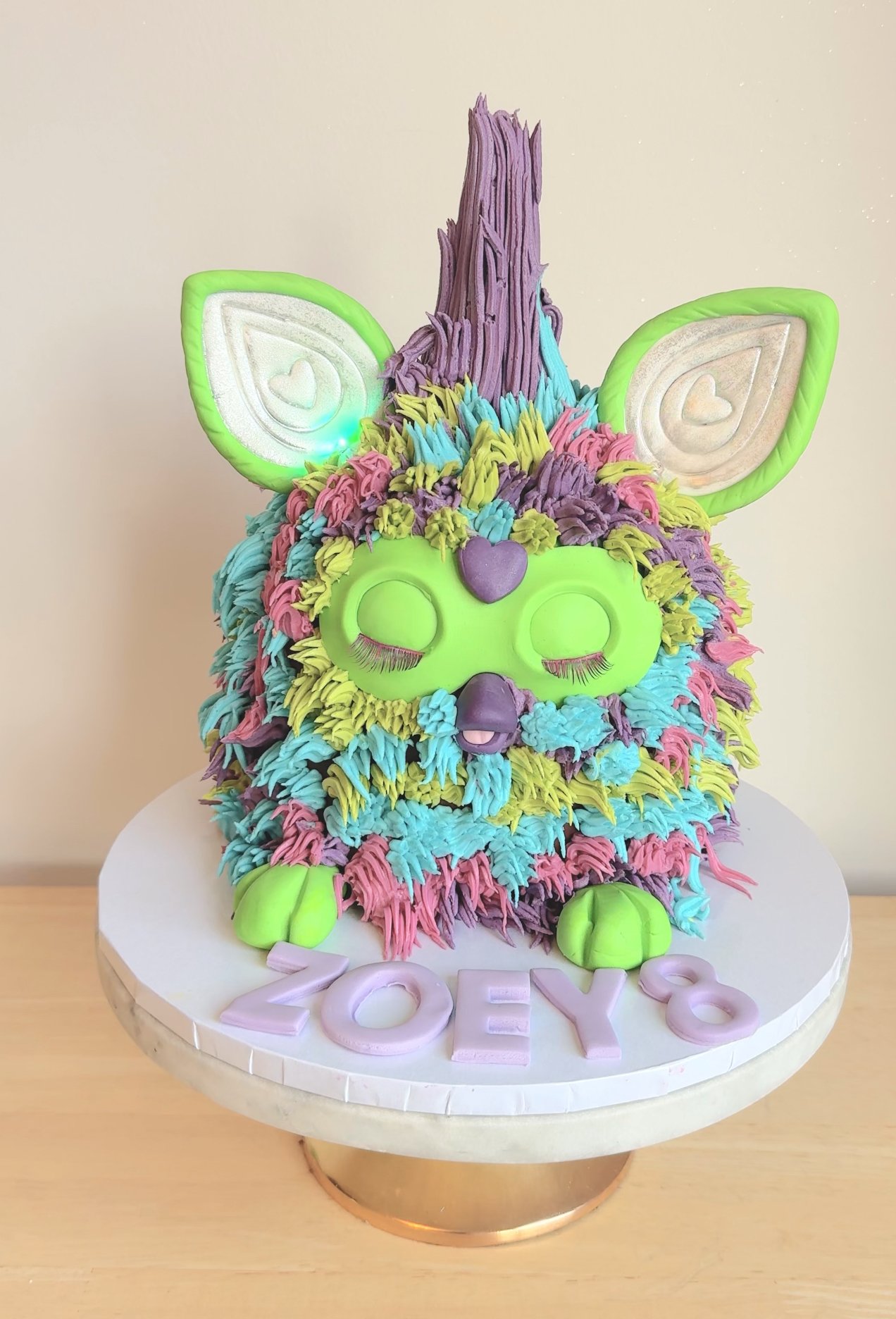 Bright, bold, and full of character, this Furby Cake is a must-have for any fan of the playful, interactive toy! Covered in vibrant, textured buttercream to mimic Furby’s fluffy fur, this cake stands out with its adorable facial details, heart-shaped nose, and fluttery lashes. The best part? The light-up ears add a magical touch, making this cake just as fun and animated as the real thing! Perfect for birthdays and celebrations, it’s a showstopping centrepiece that brings the joy of Furby to life.