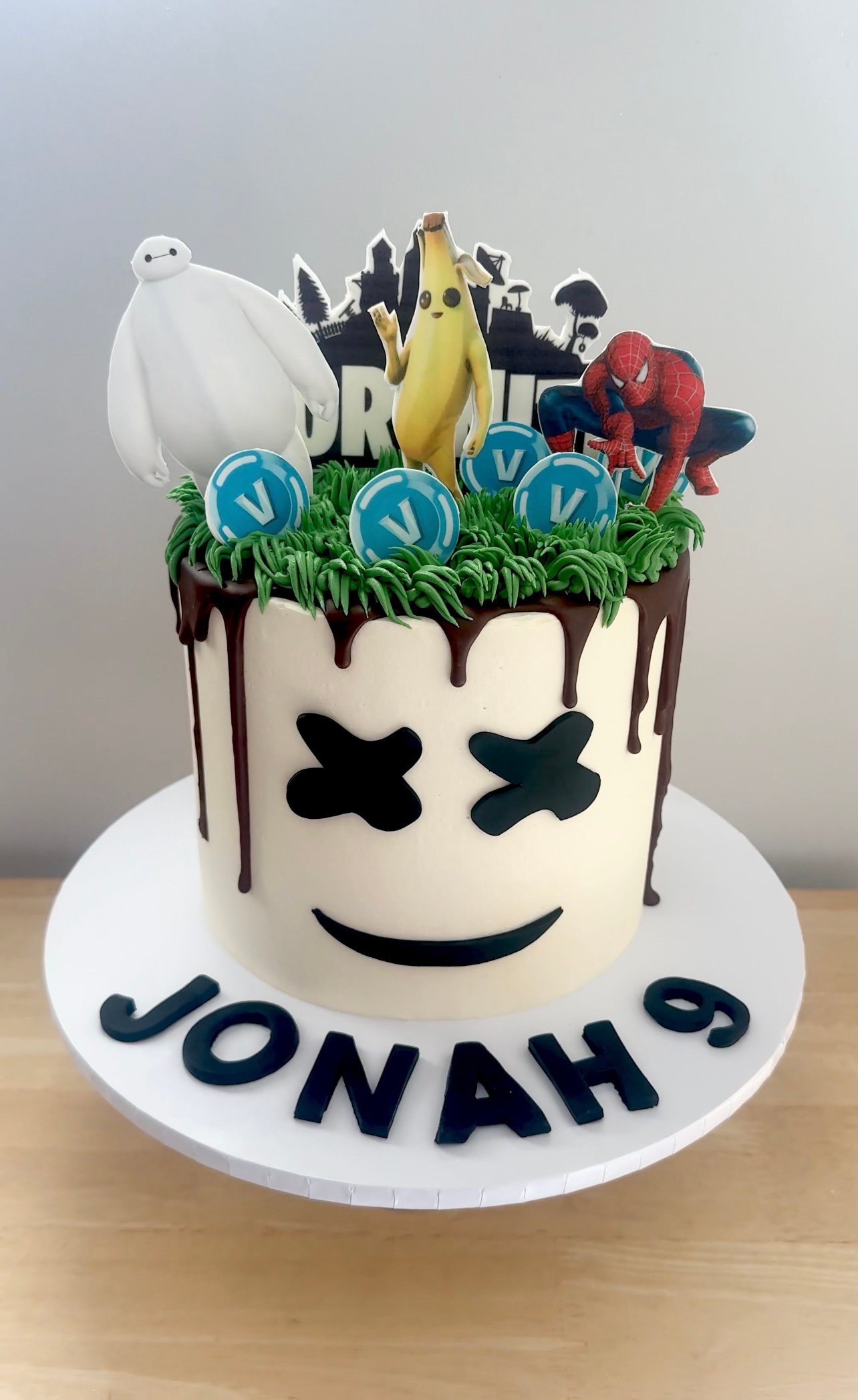 Level up the birthday celebrations with this Gaming Mashup Cake, perfect for any gaming enthusiast! Featuring a bold design inspired by the popular DJ Marshmello, this cake is topped with edible images of fan-favourite gaming characters, including Fortnite’s Peely, Spider-Man, and Baymax. The vibrant green “grassy” buttercream, chocolate drip effect, and iconic V-Bucks details make this cake a true showstopper. Ideal for gaming fans, this cake can be customised to include any favourite characters or themes.