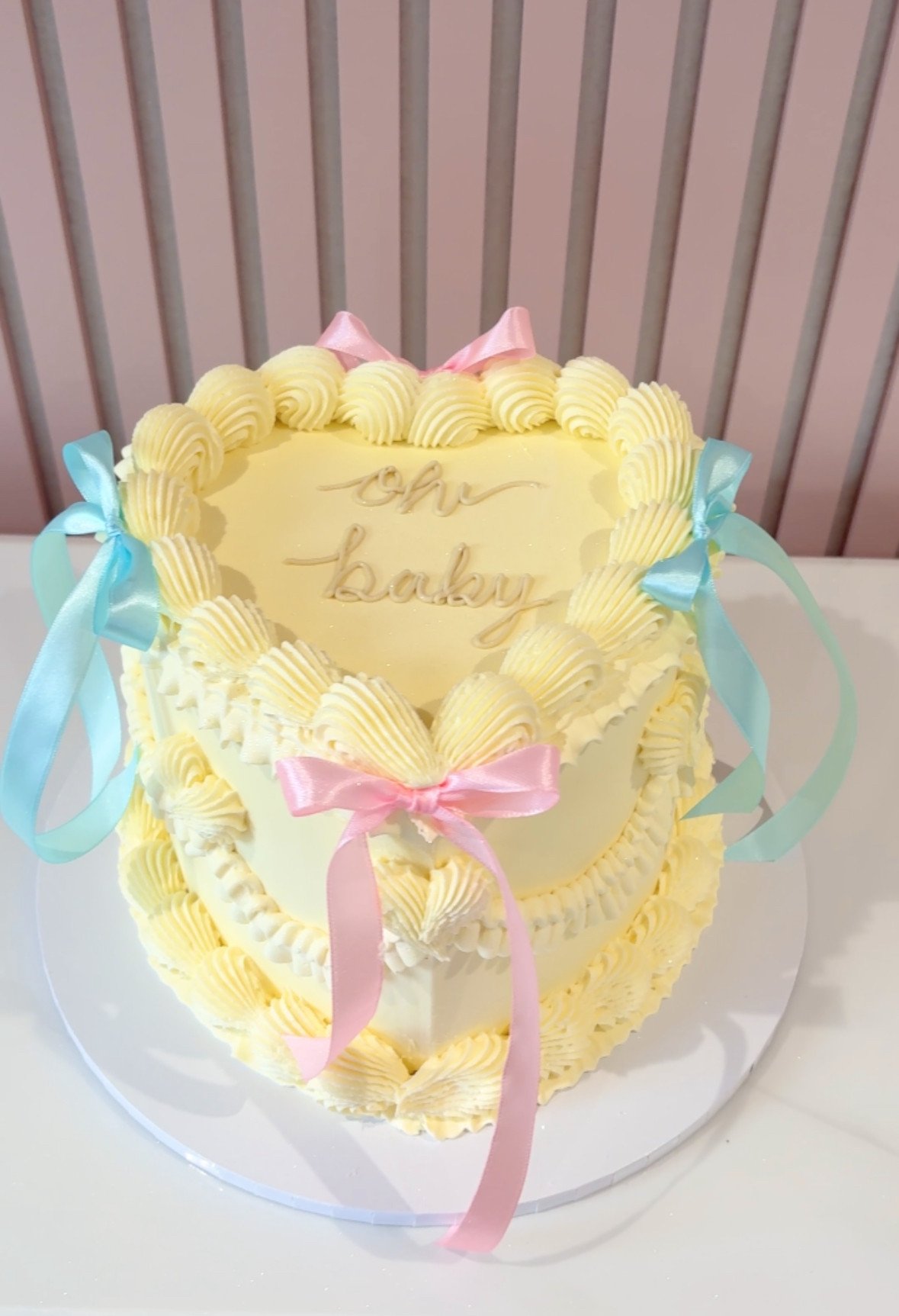 This elegant heart-shaped gender reveal cake is finished in smooth buttercream with delicate piped detailing and soft satin bows, creating a timeless and refined look. The real surprise is hidden inside — the sponge can be baked pink or blue to reveal the baby’s gender when the cake is cut. For couples who wish to be surprised themselves, the scan results can be shared with us in confidence, allowing the cake to be prepared without the parents knowing the outcome in advance. Understated on the outside and meaningful within, this cake is a beautiful way to share such a special moment.