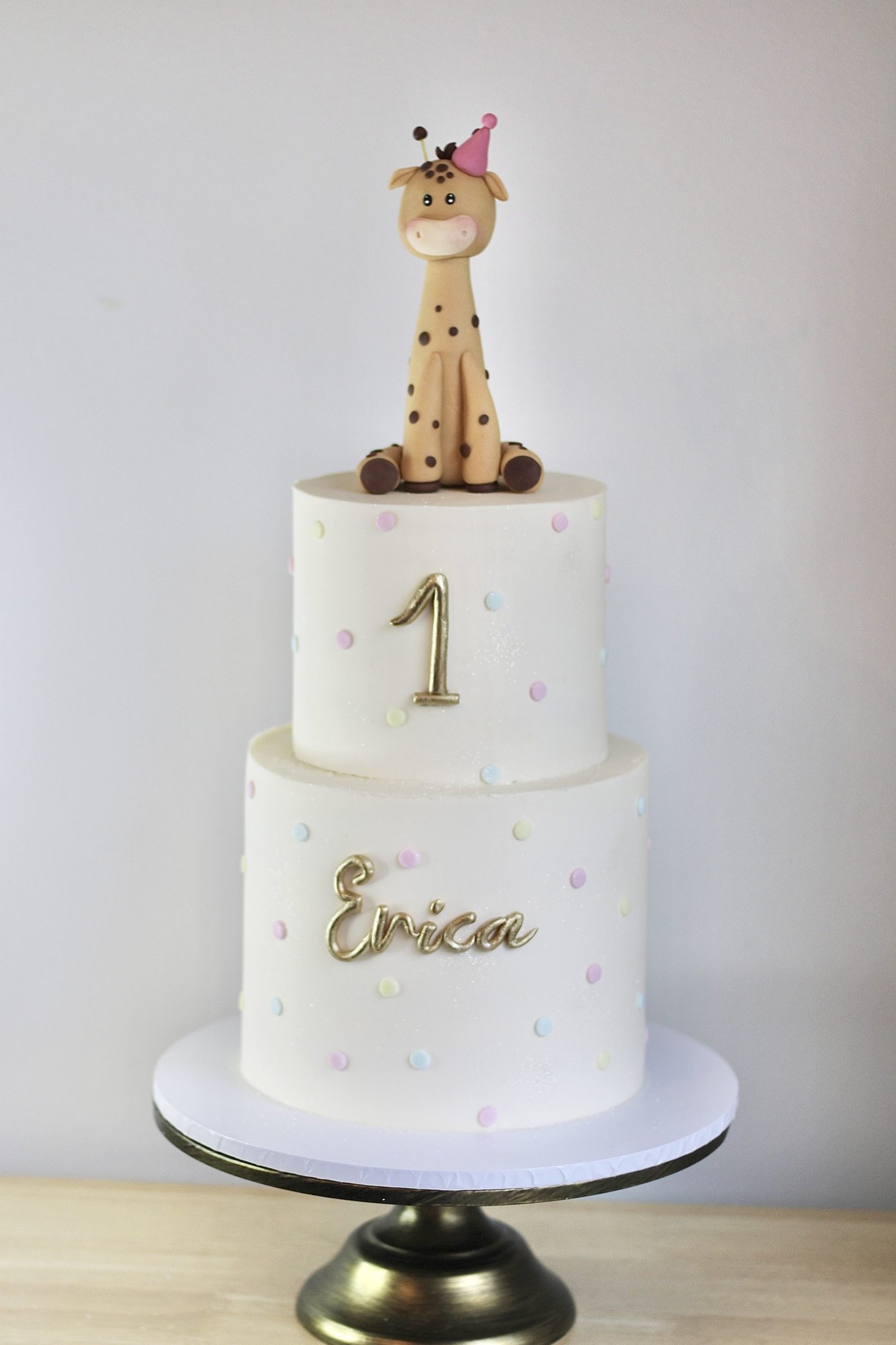 This delightful Giraffe Birthday Cake is the perfect treat for any animal-loving child! Featuring a handcrafted giraffe topper wearing a tiny party hat, this elegant two-tier cake is decorated with soft pastel polka dots and finished with a personalised name and age. A sweet and stylish choice for a jungle-themed celebration or any special occasion.