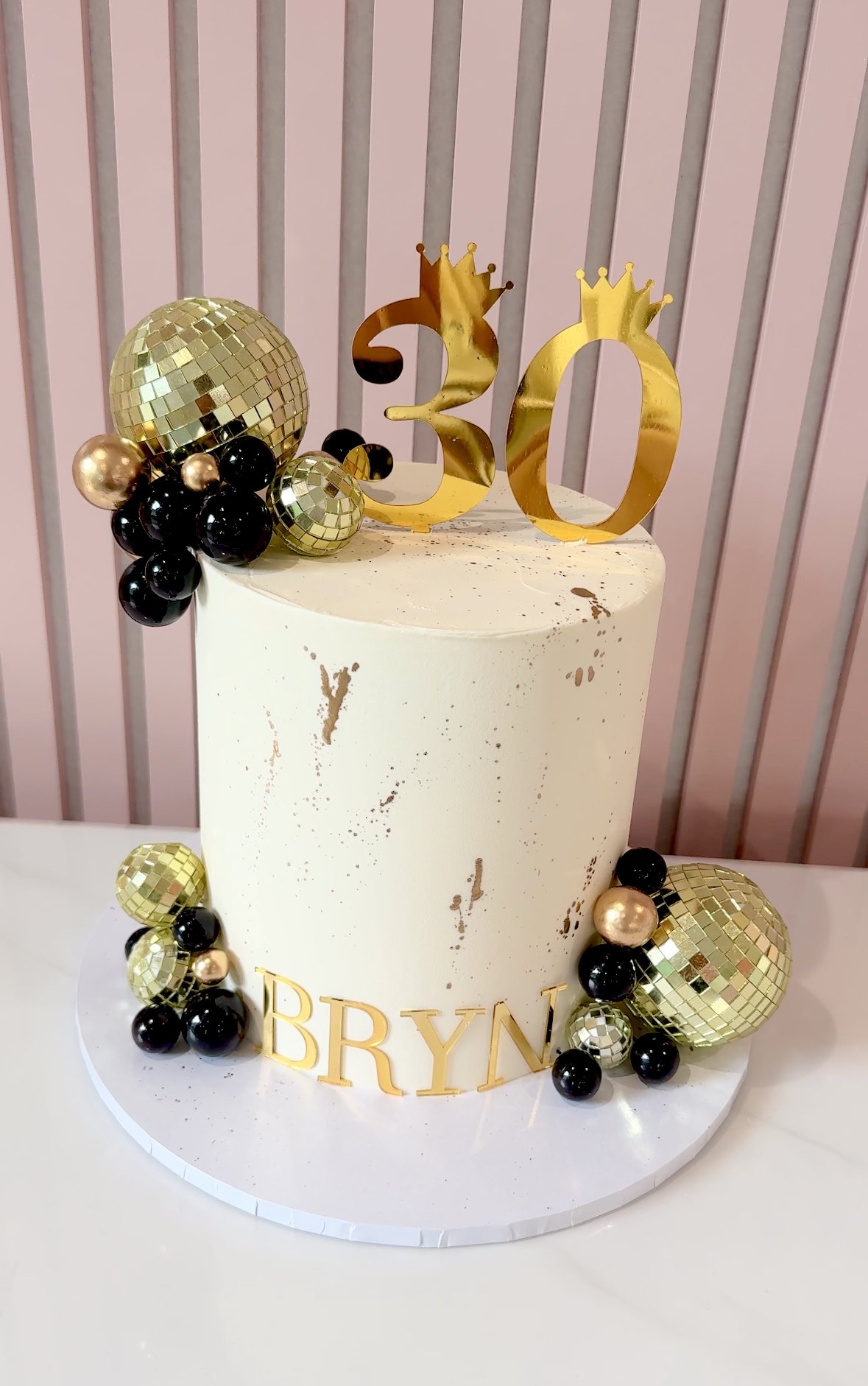 Celebrate in style with this bold and glamorous black and gold cake, complete with shiny disco balls, metallic accents, and a custom topper for the age of your choice. Perfect for a party-loving king or queen, this design is ideal for milestone birthdays and big celebrations. Name and age can be customised.