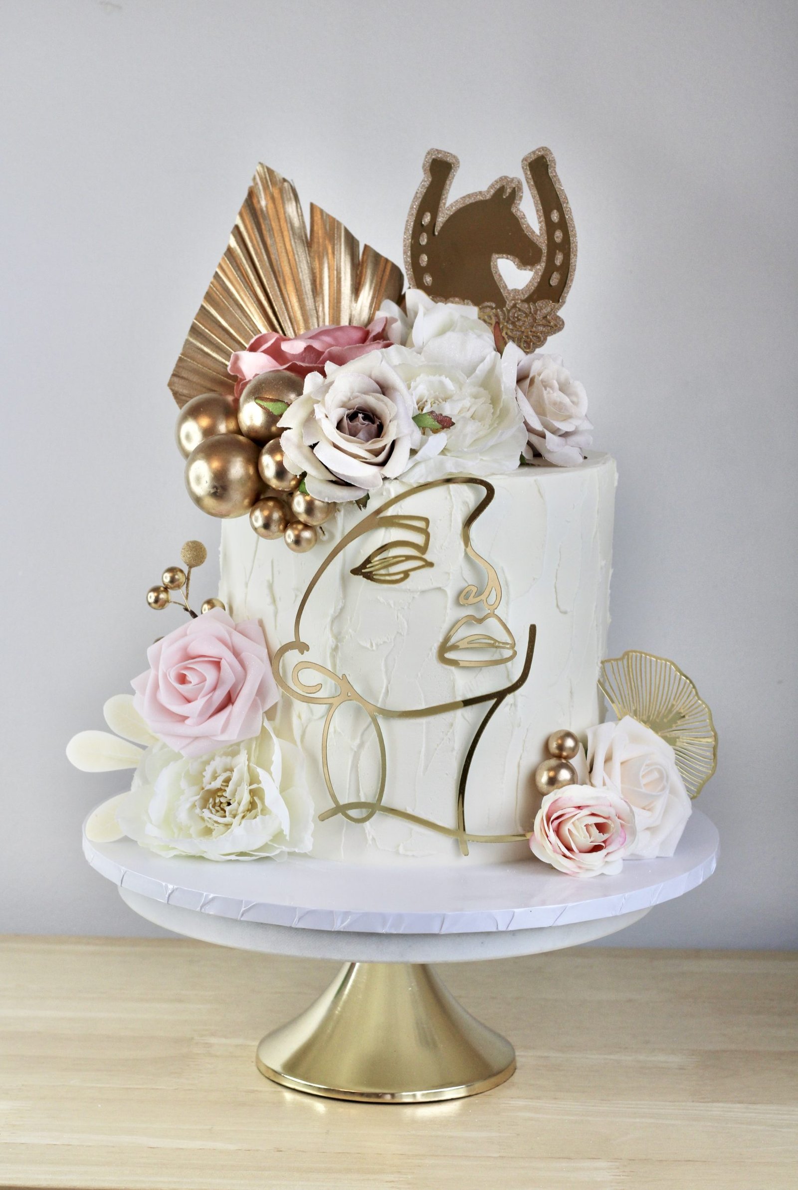 Indulge in elegance with the Golden Grace Cake, a masterpiece of sophistication and artistry. Featuring a textured ivory buttercream base, this cake is adorned with a striking gold face outline, luxurious artificial roses, and shimmering gold embellishments. A gold horseshoe topper adds a unique touch, perfect for equestrian lovers or those who appreciate refined design. Finished with metallic spheres and delicate floral details, this cake is an exquisite choice for birthdays and special celebrations.