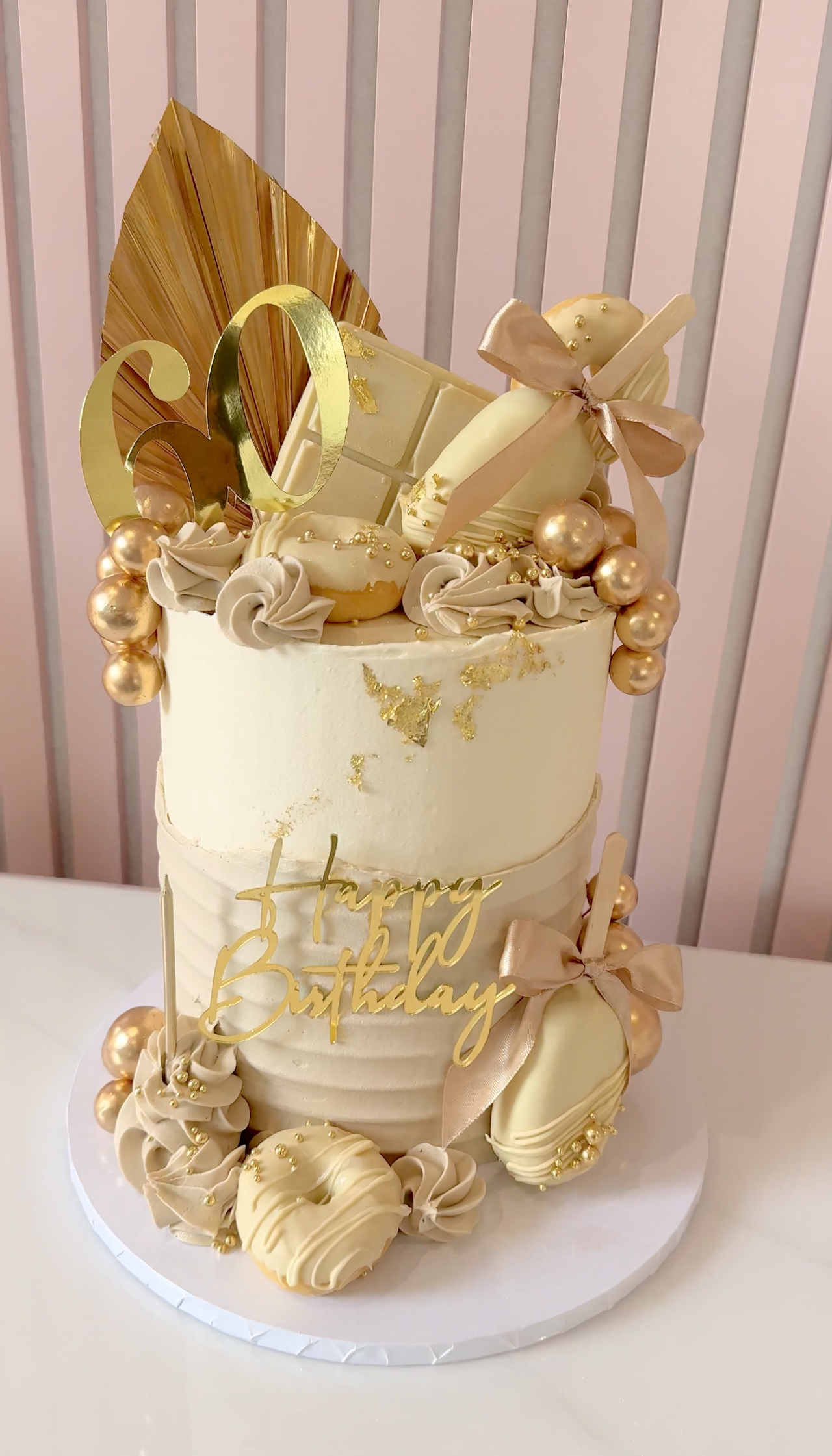 This Golden Luxe Treat Cake is the epitome of opulence, perfect for a truly show-stopping birthday celebration. Covered in silky buttercream and adorned with gold-dusted chocolate-dipped treats, shimmering gold spheres, and a fan detail for extra flair, this tall two-tier design is finished with elegant piping and a metallic number topper. Ideal for marking a special birthday in glamorous style.
