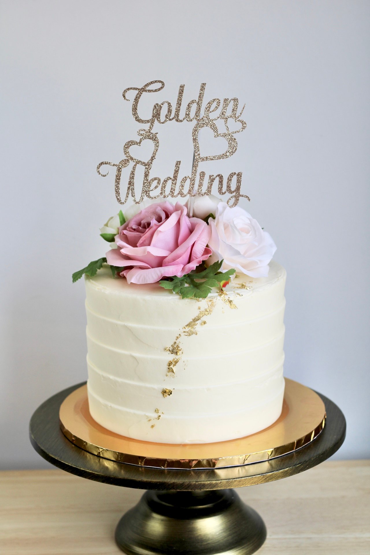 Celebrate 50 years of love and commitment with this elegant Golden Wedding Anniversary Cake. This stunning design features a smooth ivory buttercream finish with delicate horizontal textures, adorned with a touch of gold leaf for a subtle yet luxurious effect. A beautiful arrangement of artificial roses in soft blush and white sits gracefully on top, complemented by a shimmering “Golden Wedding” topper that adds a celebratory touch. Perfect for marking this remarkable milestone with sophistication and sweetness.