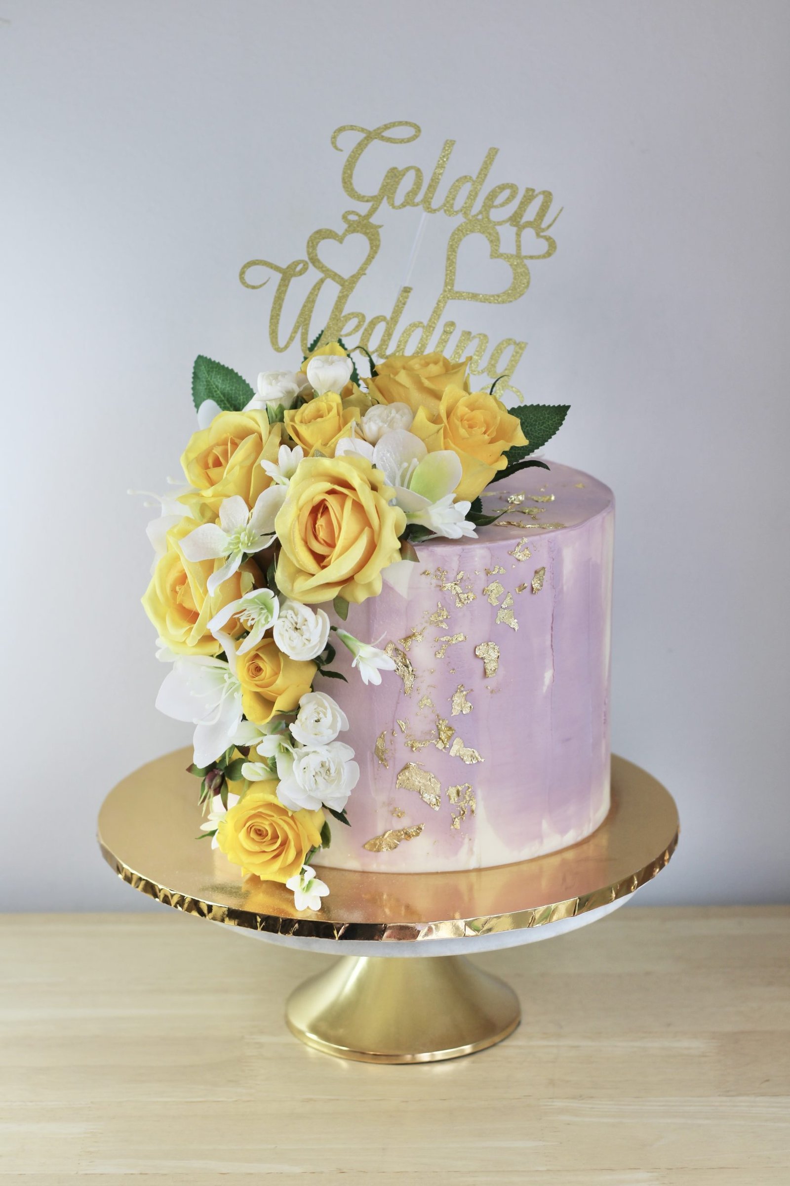 Mark 50 years of cherished memories with this breathtaking Golden Wedding Anniversary Cake. Featuring a sophisticated watercolour buttercream finish in soft lavender and ivory, this cake is adorned with striking gold leaf details for an elegant touch. A stunning cascade of artificial golden yellow and white roses flows gracefully down one side, adding a luxurious and romantic feel. The shimmering “Golden Wedding“ topper completes the design, making it the perfect centrepiece for a truly special celebration.