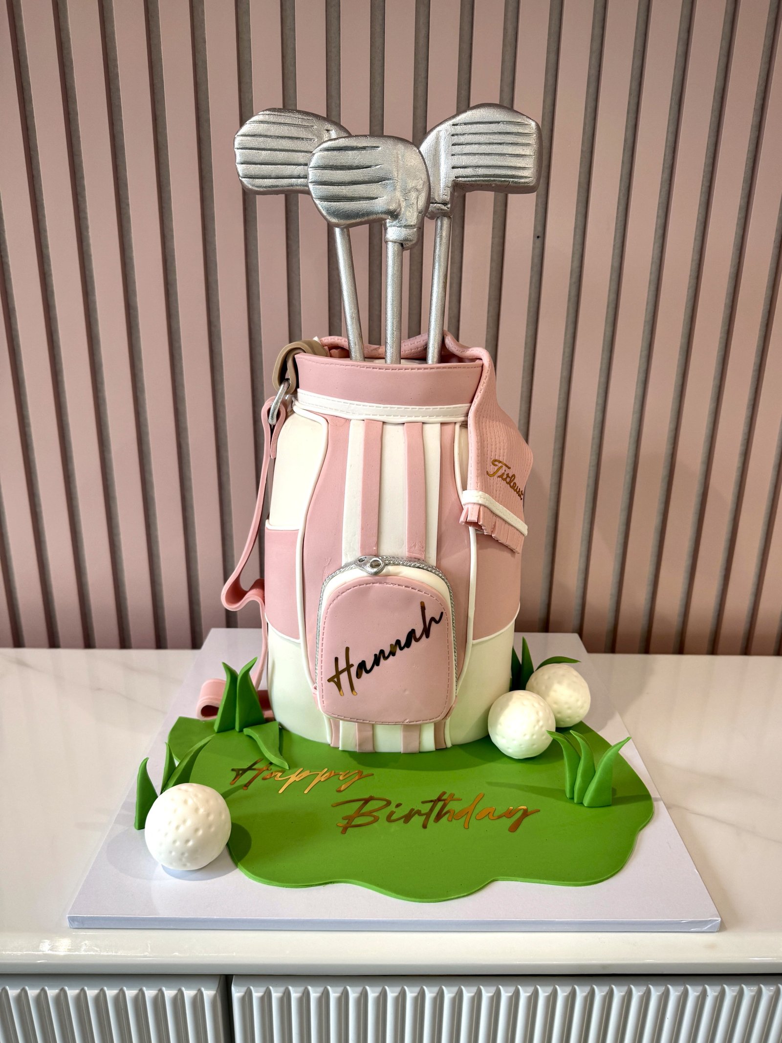 This sculpted golf bag cake is designed to resemble a classic golf bag, complete with detailed club toppers, strap accents, and panelled detailing for a realistic finish. Set on a green base with decorative golf elements, the cake makes a striking centrepiece for a golf enthusiast. A personalised name on the front pocket completes the design, while colours and finishing details can be customised to suit individual preferences.