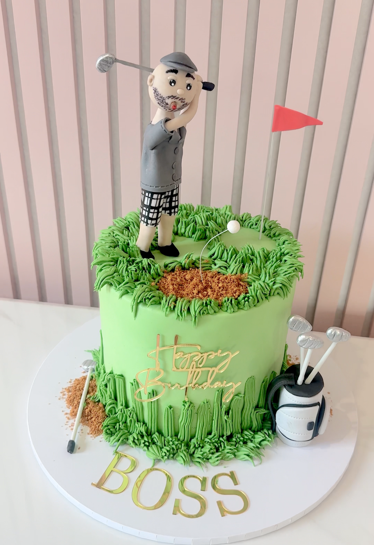 This golf-themed birthday cake is a true hole-in-one for any fan of the fairway. Decorated with piped green grass, a golf ball and flag, a set of fondant golf clubs, and a bunker of crushed biscuit “sand,” it’s the perfect celebration centrepiece. Topped with a standout golfing figurine in full swing, this cake brings the spirit of the game to life.