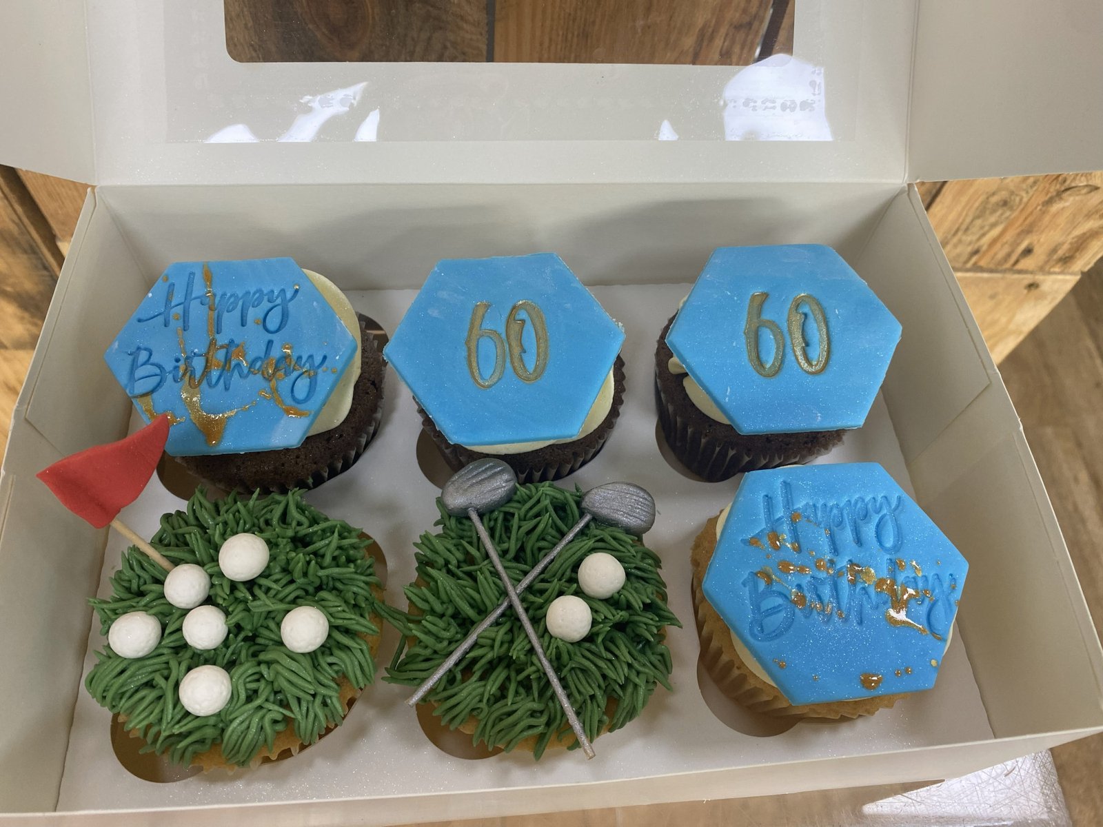 These golf-themed cupcakes are a fun and stylish choice for celebrating a special birthday, featuring textured green buttercream designed to resemble a putting green, finished with golf balls, crossed clubs, and blue fondant toppers personalised with a message or age. Ideal for milestone birthdays or golf lovers of any age, they make a playful yet polished addition to any celebration.