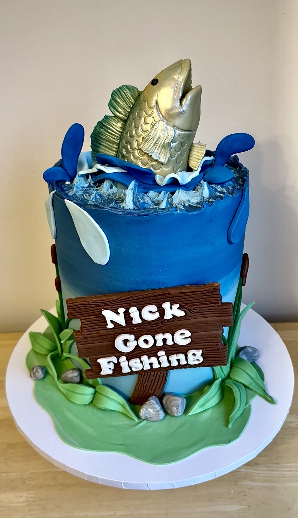 A fun fishing-themed celebration cake featuring a vibrant blue buttercream finish designed to resemble water, complete with fondant splash details and a striking handcrafted jumping fish topper capturing the moment of a big catch. At the front of the cake, a rustic wooden-style fondant sign reads “Gone Fishing,” surrounded by fondant grass, stones and lakeside details that bring the whole scene to life, making it a perfect choice for birthdays or celebrations for anyone who loves fishing.