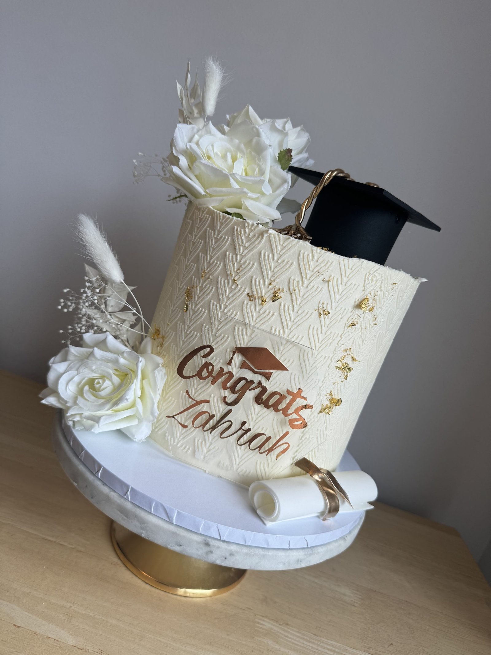 Celebrate a momentous academic achievement with this stunning ivory graduation cake. Featuring an elegant textured design with gold detailing, this cake exudes sophistication. A black fondant graduation cap with a gold tassel sits atop, symbolising success, while delicate artificial white roses and a rolled fondant diploma add a refined touch. Perfect for honouring a graduate in the most stylish way!