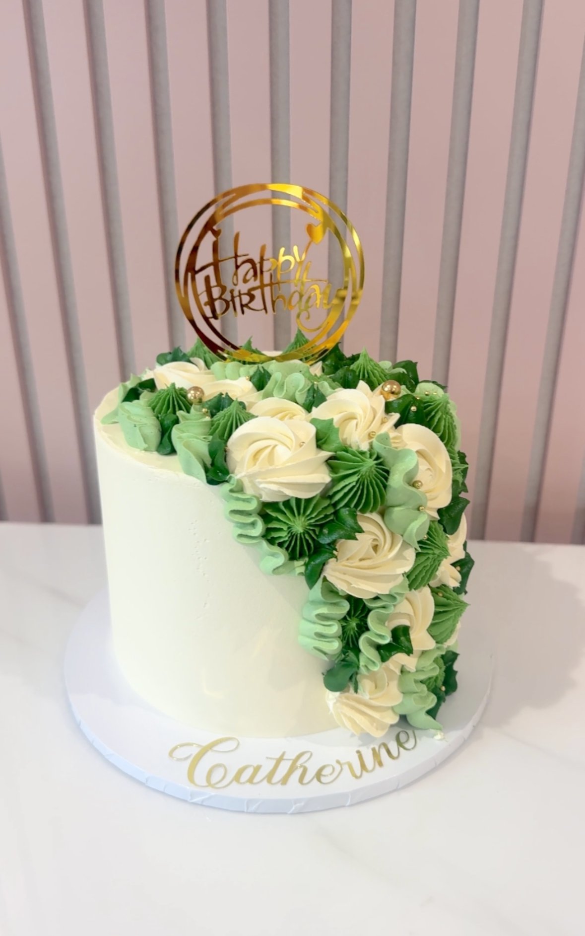 Elegant and eye-catching, this beautifully piped cake features a cascade of cream and green buttercream swirls, rosettes, and textures, flowing gracefully from top to base. Accented with gold pearls and a smooth buttercream finish, it’s a perfect choice for a refined birthday celebration. The name and colours can be customised to suit any style.