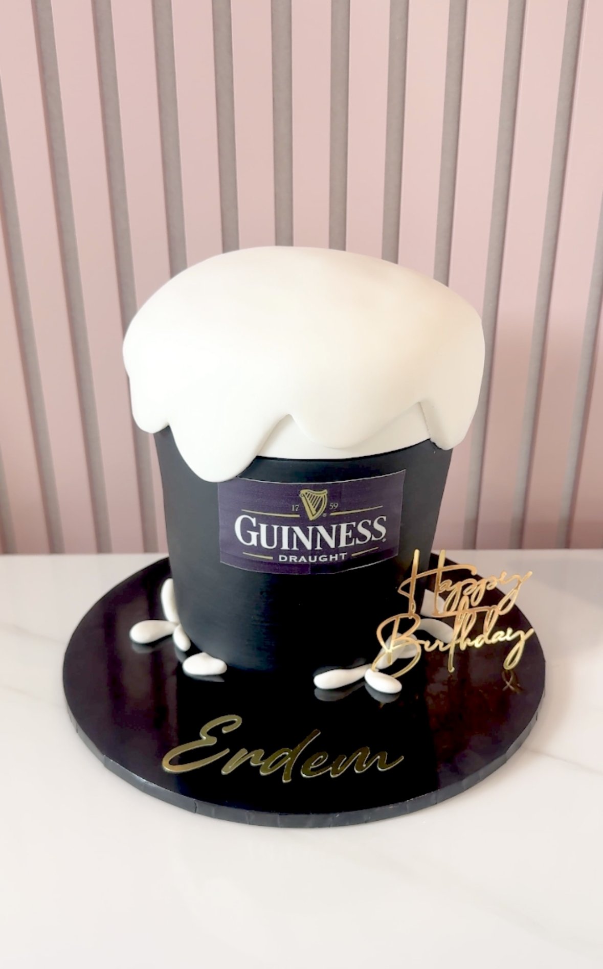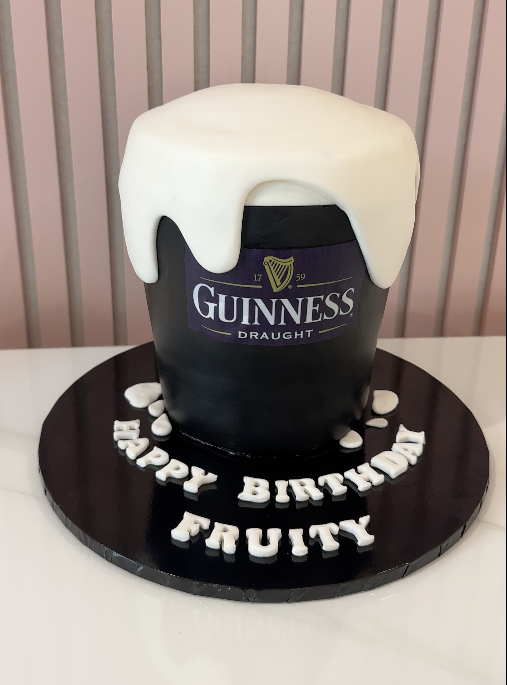 Raise a toast with our Guinness Cake! Crafted to resemble a perfect pint, this cake features a deep black fondant base with a frothy white “foam” top for an ultra-realistic finish. Whether you’re celebrating a birthday, retirement, or any special occasion, this cake is perfect for lovers of the black stuff.