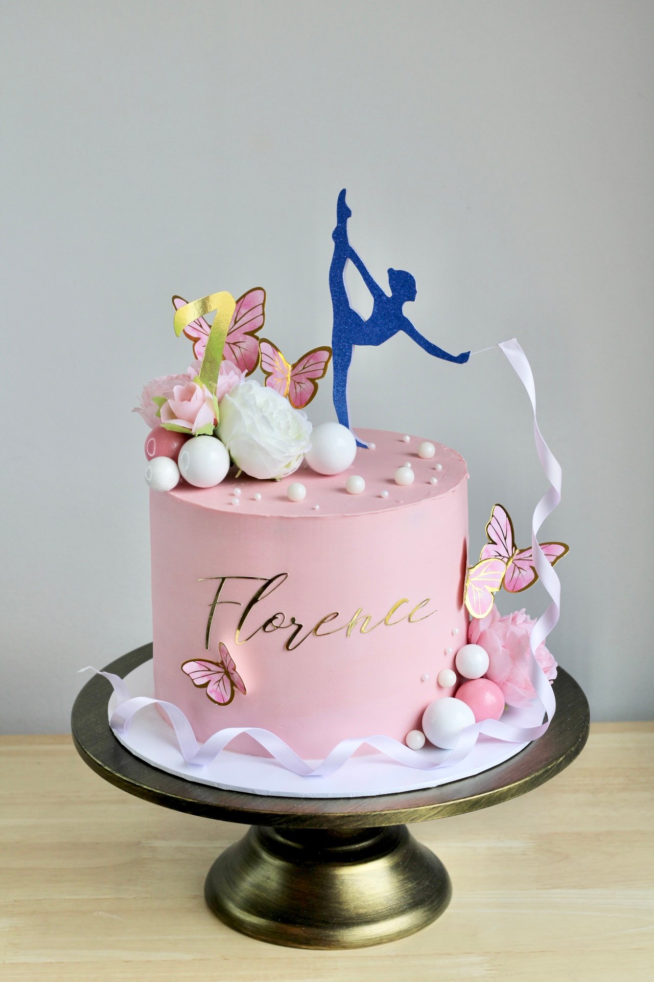 Celebrate a little gymnast’s big day with this stunning gymnastics-themed birthday cake! Designed in a soft pink hue, this cake features a sparkling silhouette of a gymnast performing with a ribbon, elegant butterflies, and delicate artificial flowers. Edible pearls and swirls of ribbon add a touch of grace, making it the perfect centrepiece for a gymnastics-loving birthday star.