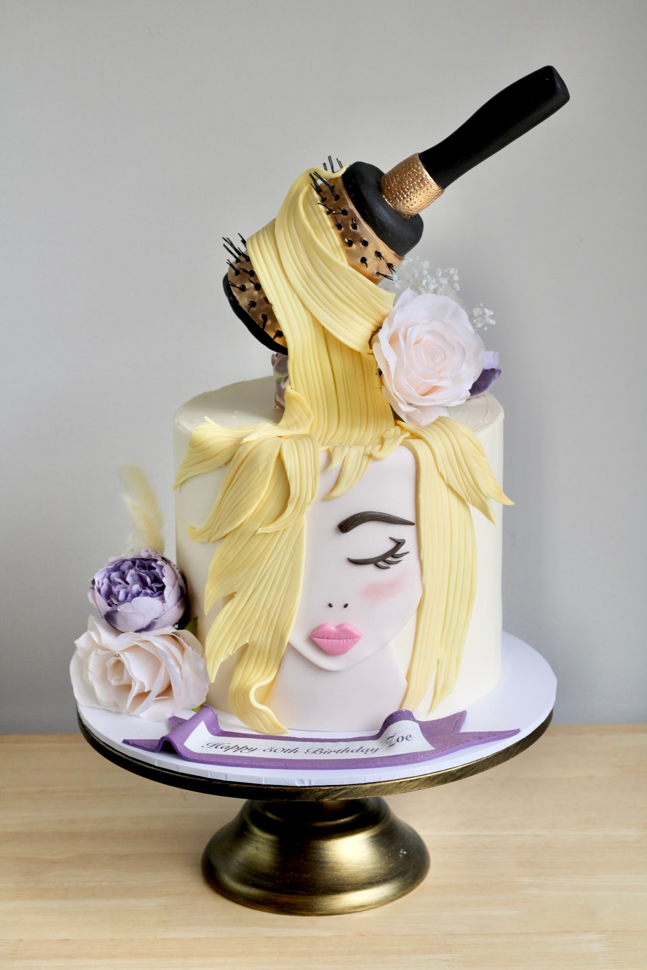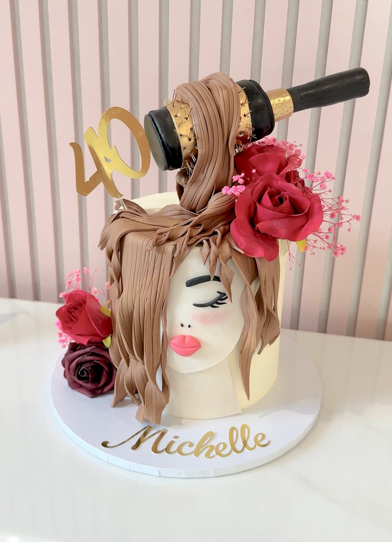 Perfect for stylists and beauty lovers, the Hairstylists Glamour Cake is a stunning tribute to the world of hair and beauty. This unique cake features an intricate fondant design of a stylish woman with cascading golden locks, caught in a realistic round brush. Accented with delicate artificial roses and soft lilac tones, this cake is a statement piece for birthdays, salon openings, or any occasion that celebrates style and creativity.
