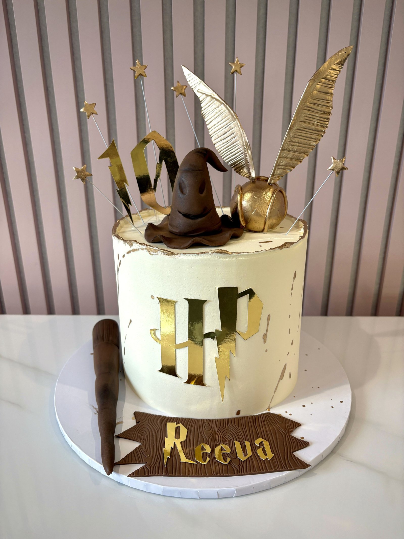 Harry Potter Cake V6 is a striking design inspired by the wizarding world, featuring a clean ivory finish with gold detailing, the iconic HP emblem, a golden snitch, wizard hat and wand for a magical centrepiece. Finished with star accents and a statement age topper, this cake is perfect for Harry Potter fans who want a bold, themed birthday cake that feels both fun and refined