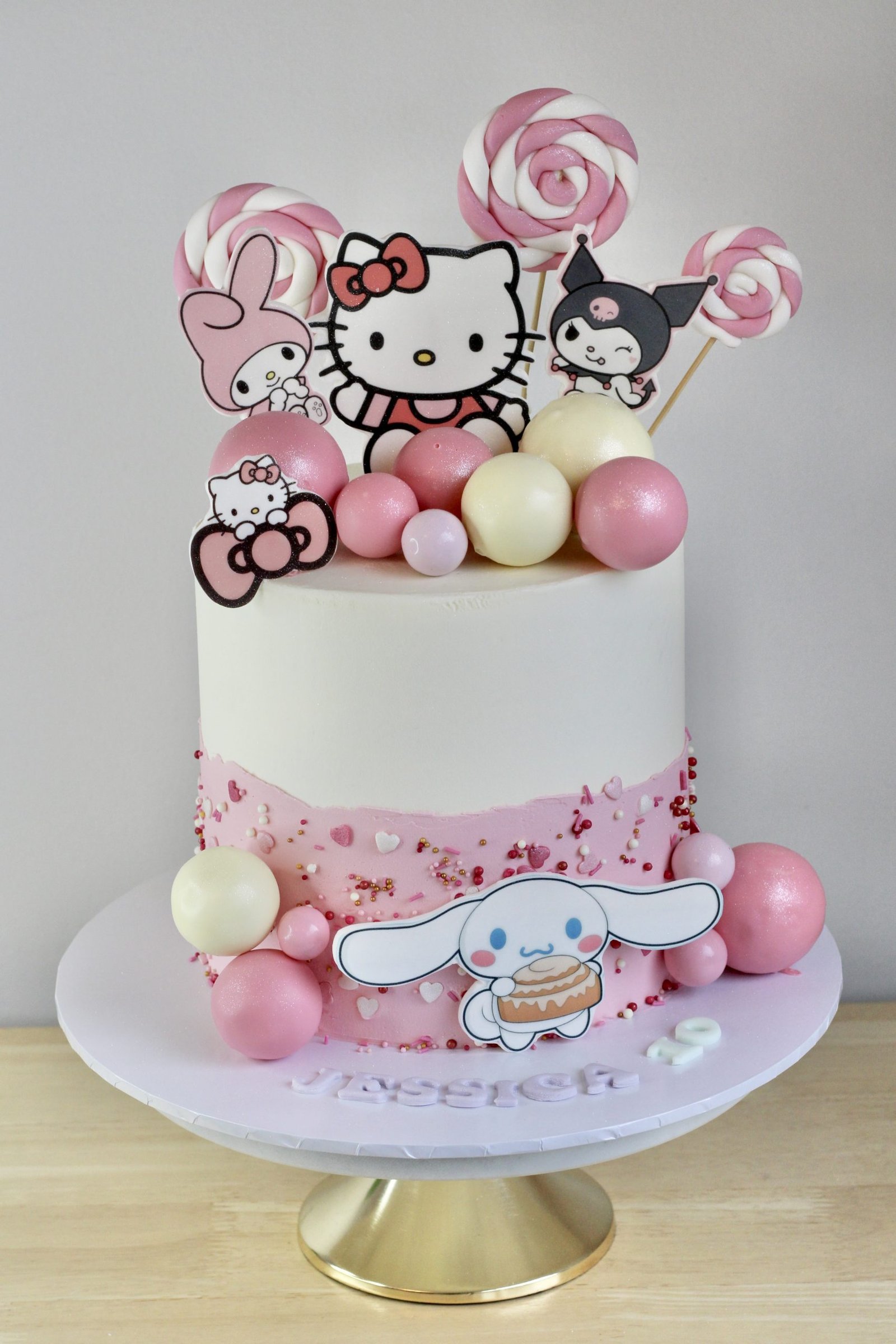 A pastel pink dream for any Hello Kitty fan! This adorable cake features a smooth buttercream finish with a soft pink gradient, topped with charming Hello Kitty-themed decorations. Playful character toppers, decorative swirls, and shimmering spheres complete the sweet and whimsical design, making it the perfect centrepiece for a cute and fun-filled celebration.