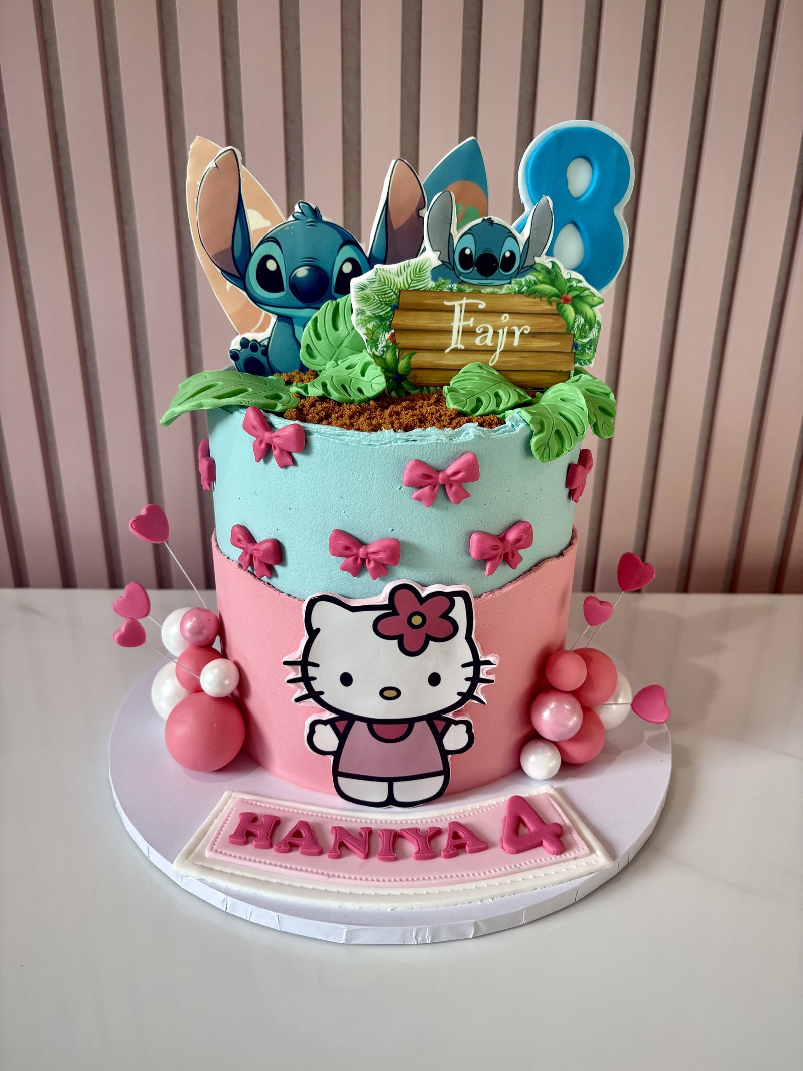 A fun and colourful birthday cake combining two much-loved characters, Hello Kitty and Stitch. The design features soft pink and blue buttercream with playful bow details, topped with vibrant jungle-style decorations and character toppers for a lively finish. Hello Kitty takes centre stage on the front, while Stitch and themed elements bring extra personality to the design. Finished with a personalised name and age, this cake is perfect for children who love cute characters and bright, playful celebrations.