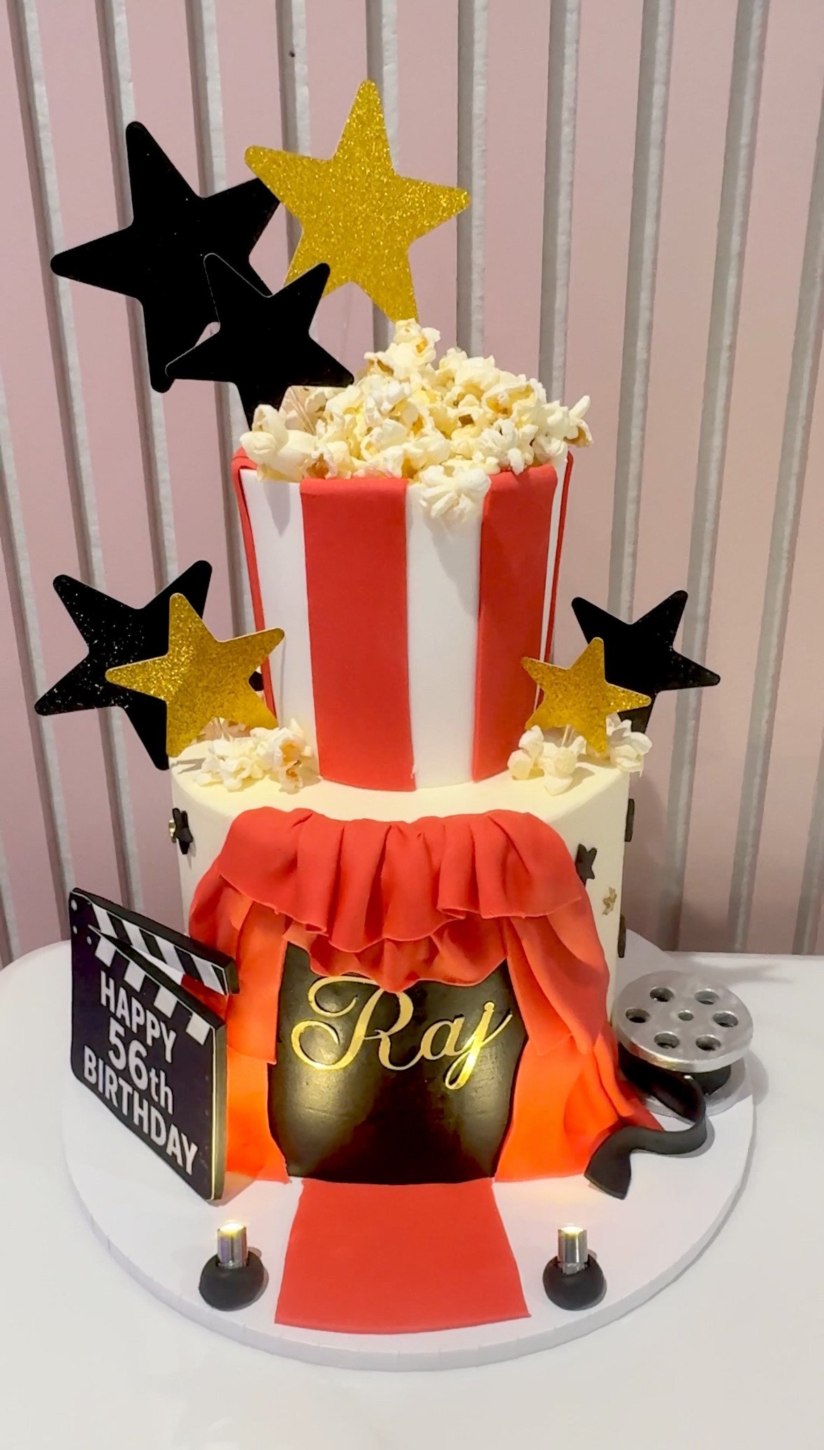 Inspired by the excitement of a Hollywood film premiere, this striking two-tier design features bold red and ivory detailing, dramatic draped fondant styled as theatre curtains, a cinematic popcorn centrepiece with gold and black stars, and subtle built-in lights that softly illuminate the entrance and name for a true red carpet effect. Finished with a sleek black panel and elegant script, every element is carefully handcrafted to create a refined yet theatrical centrepiece that makes any celebration feel like opening night.