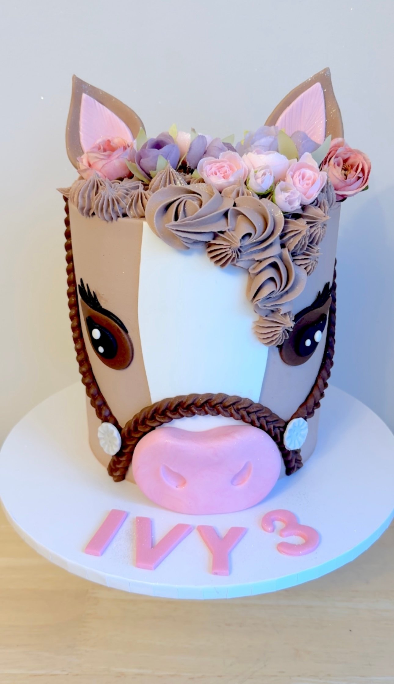 This adorable Horse Cake V1 is perfect for any little horse lover! Designed with a sweet horse face, complete with expressive eyes, a braided bridle, and a soft pink muzzle, this cake is full of charm. Swirls of chocolate buttercream form a beautiful mane, while delicate artificial flowers add a touch of elegance. Whether for a horse-mad child or a countryside-themed celebration, this delightful cake will steal the show!