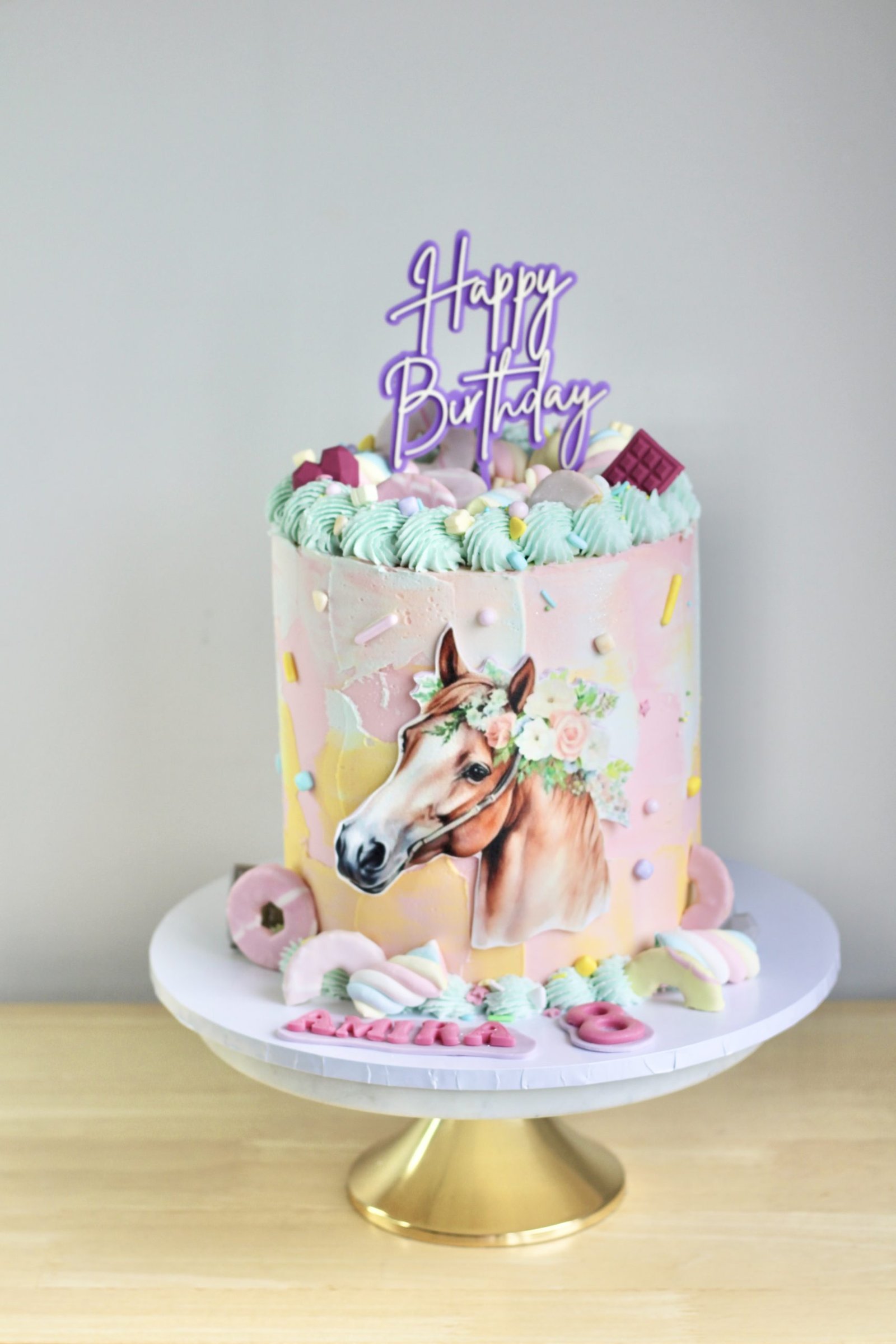 This stunning Horse Cake is a dream for any equestrian lover. Featuring a beautifully illustrated horse adorned with a floral garland, this cake is decorated in soft pastel tones with a delicate watercolour-style finish. Swirls of piped buttercream, mini chocolate bars, and sweet treats cascade around the top and base, adding an extra touch of fun. Perfect for birthdays or special celebrations, this cake is a true showstopper for anyone who adores horses and elegant designs.