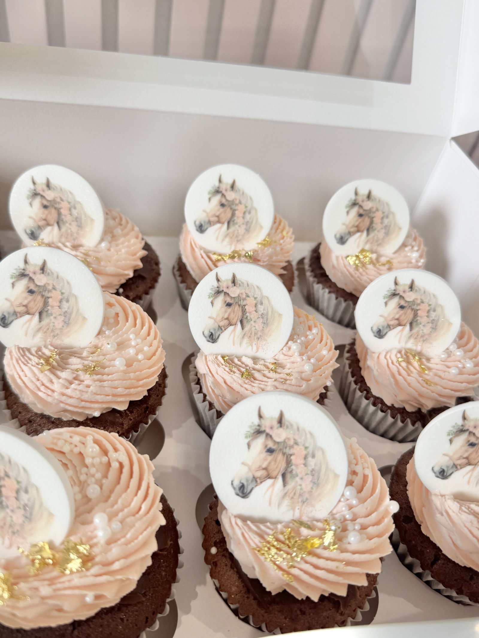 A refined set of horse-themed birthday cupcakes, finished with soft blush buttercream swirls, delicate pearl details, and elegant edible toppers featuring a graceful horse illustration. Subtle gold accents add a touch of luxury, making these cupcakes a beautiful choice for horse lovers, pony-mad children, or equestrian-inspired celebrations.