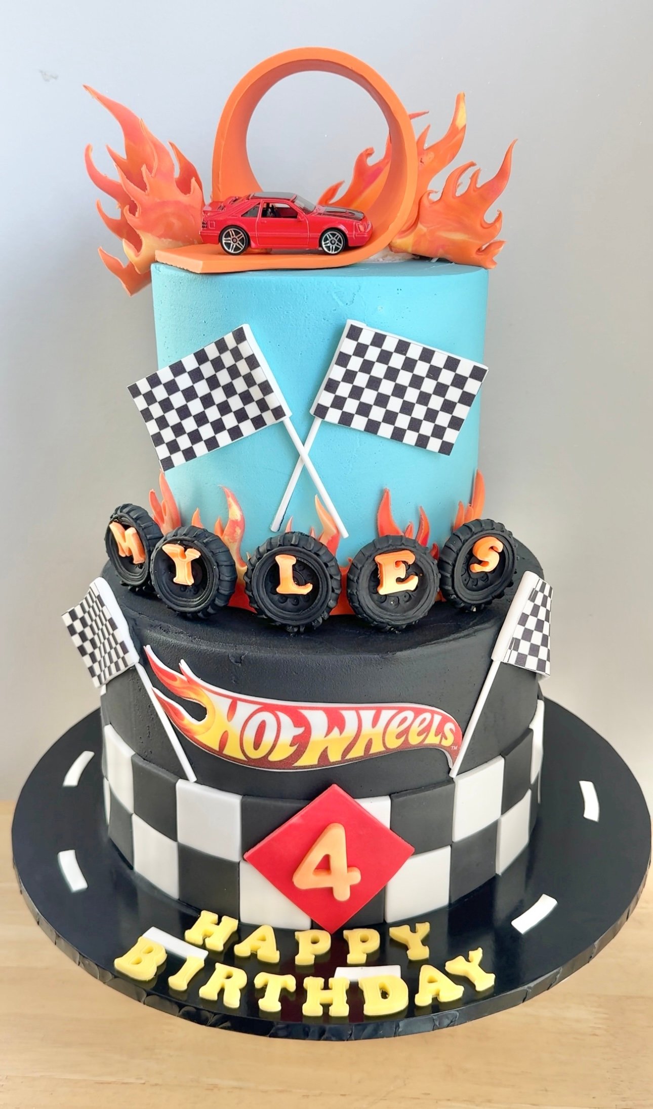 Rev up the excitement with this Hot Wheels Cake V1, the ultimate showstopper for any car enthusiast! This high-energy design features a two-tiered masterpiece with bold black and white checkered detailing, flaming accents, and racing flags. A gravity-defying loop-the-loop stunt ramp, complete with a toy race car, takes centre stage, making this cake an action-packed dream. Edible tyre decorations and fiery fondant effects complete the thrilling look, perfect for little racers.