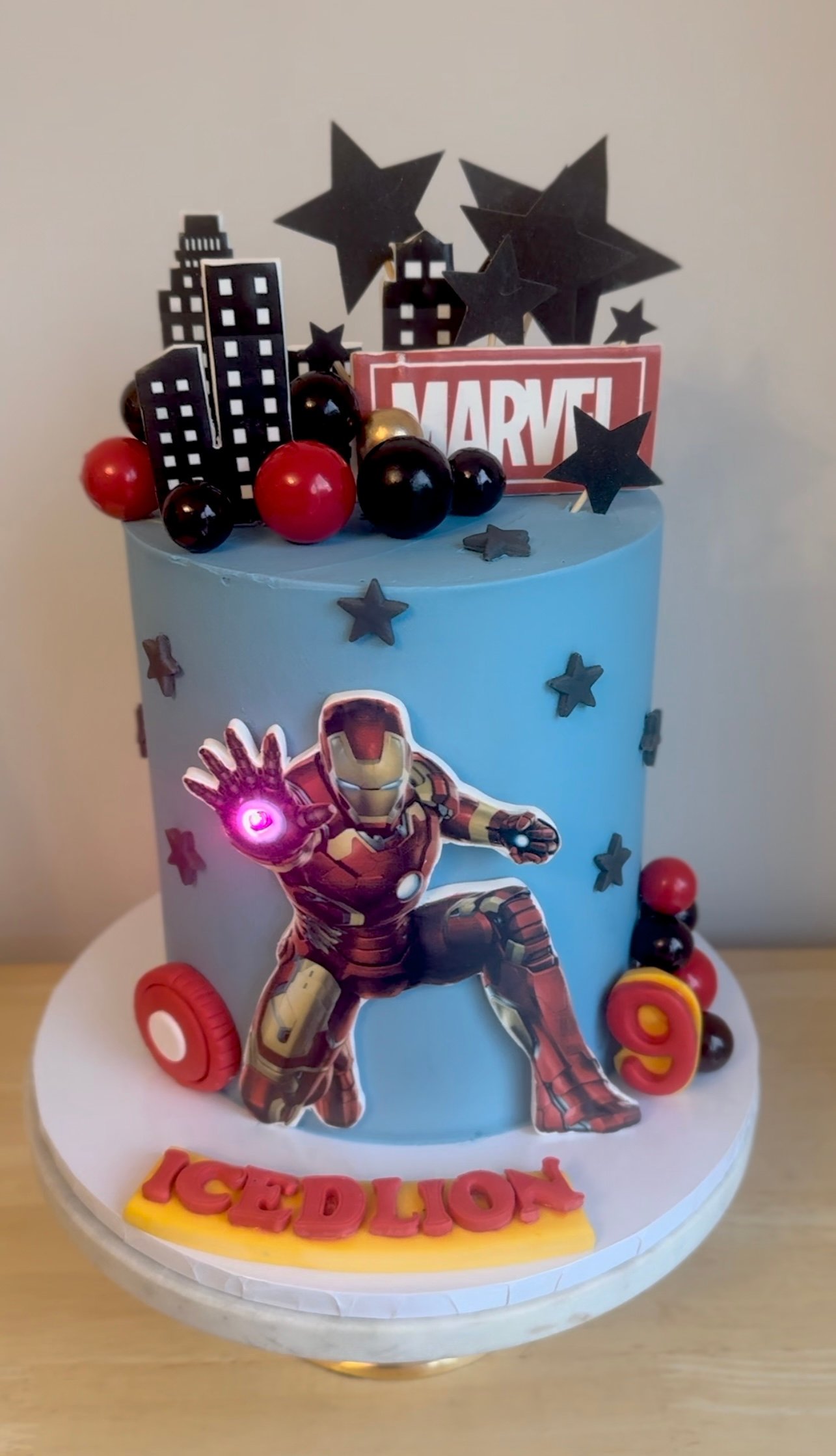 Elevate your celebration with our Iron Man Cake, a bold tribute to the legendary Marvel superhero! Featuring a sleek cityscape backdrop, dynamic black and red accents, and a striking Iron Man design with a flashing arc reactor effect, this cake is perfect for any Marvel fan. Whether for birthdays or special occasions, this superhero-inspired cake brings action and adventure to the party!