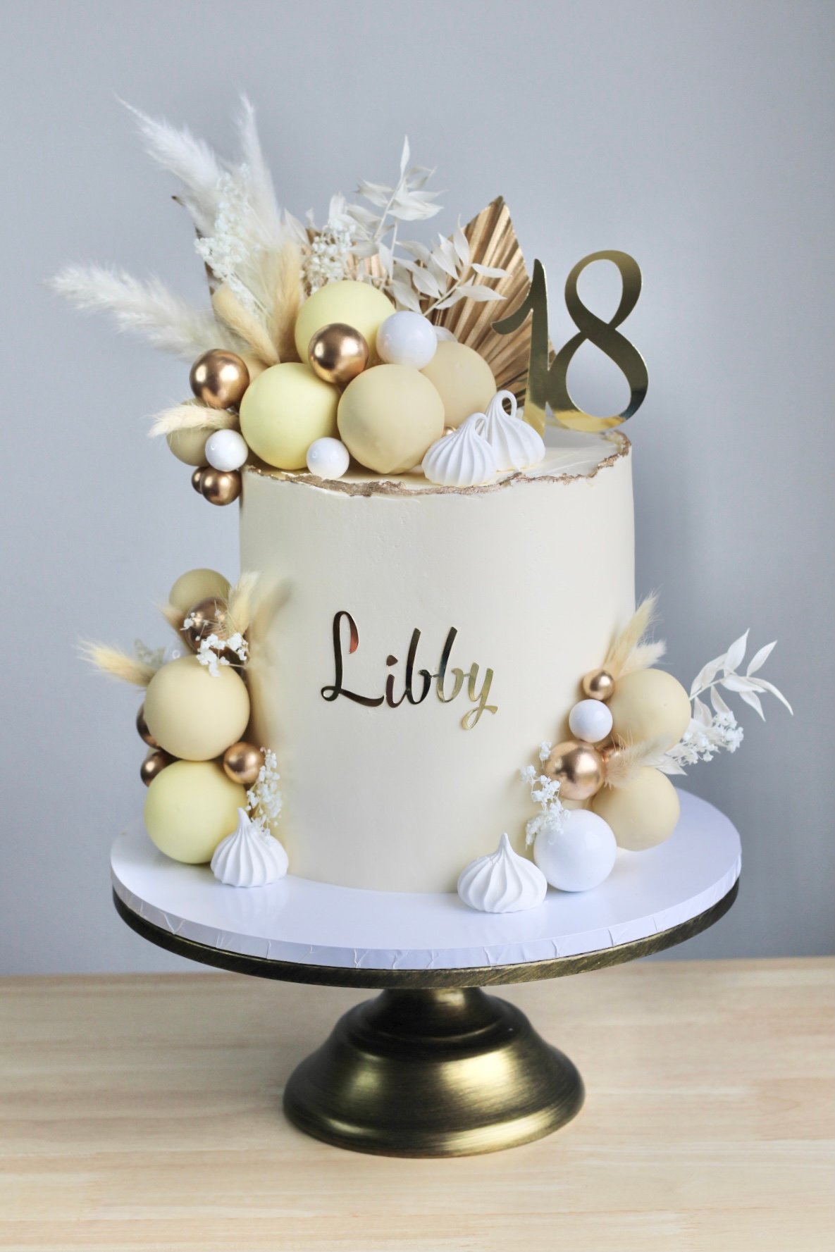 Celebrate in style with the Ivory & Gold Elegance Cake, a stunning masterpiece exuding sophistication. This luxurious cake features a smooth ivory buttercream finish, adorned with gold leaf detailing, delicate meringues, and an arrangement of golden and pastel-hued spheres. Complemented by dried florals and elegant embellishments, this cake is perfect for celebrations, adding a touch of refinement to any special occasion.