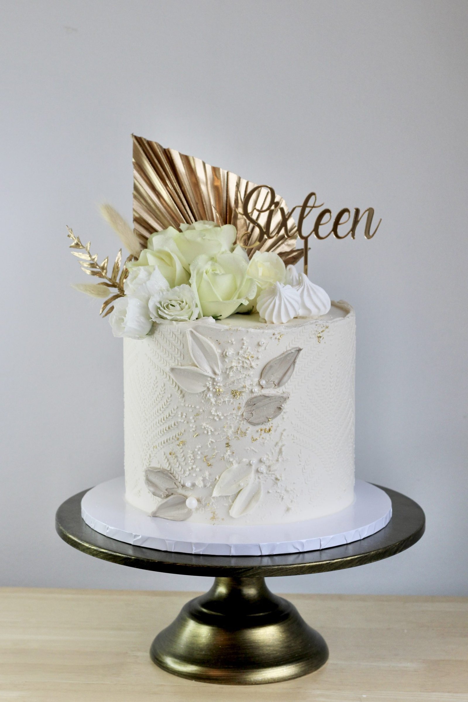 The Ivory & Gold Floral Cake is a masterpiece of sophistication, adorned with fresh flowers in soft ivory hues and elegant golden accents. Delicate piped details and handcrafted edible embellishments add texture and depth, while a golden fan accent elevates the luxurious design. This cake is a stunning choice for birthdays and celebrations, exuding timeless elegance.