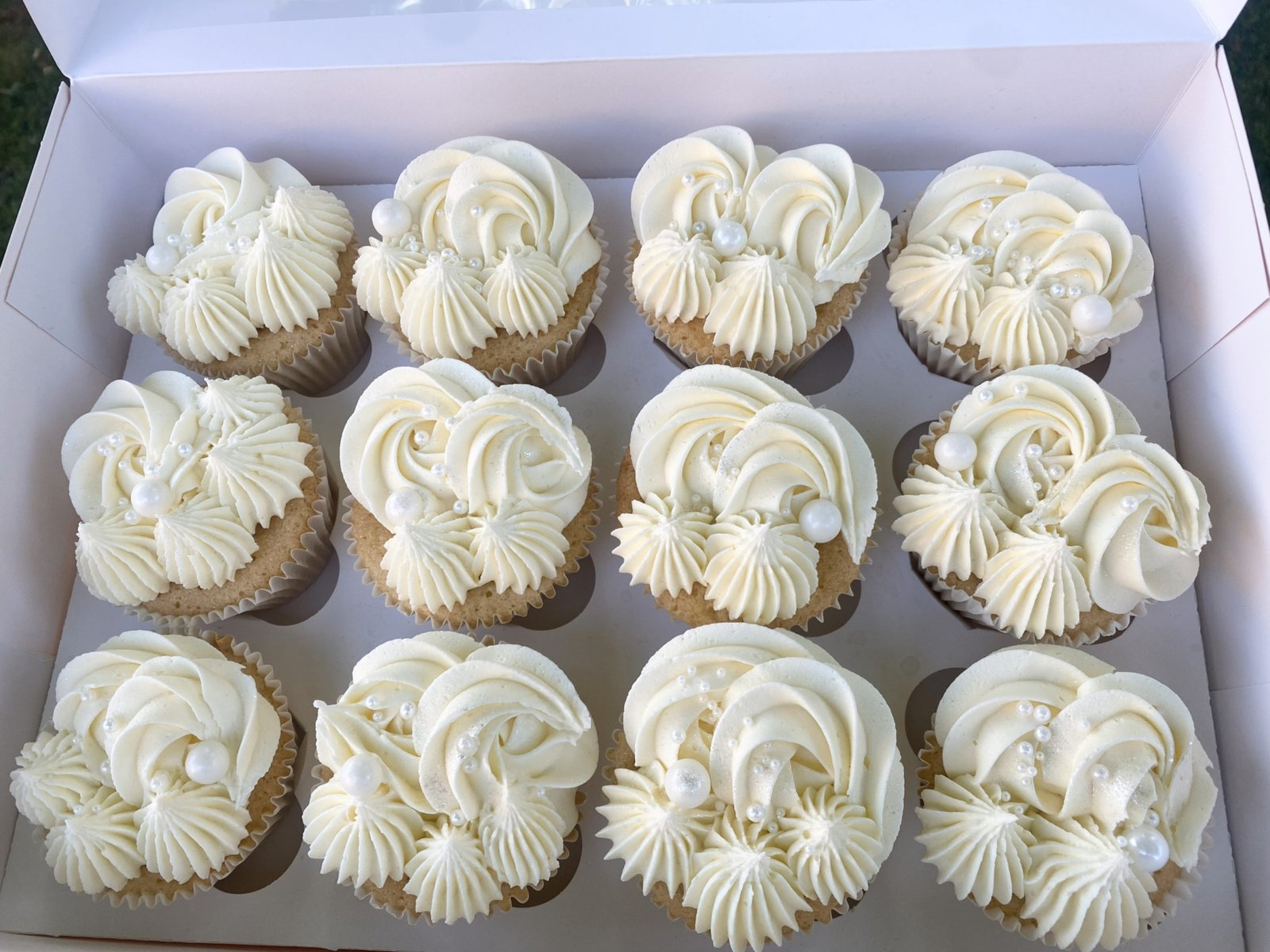 A refined set of ivory cupcakes finished with softly piped buttercream and delicate pearl detailing. Designed with a classic, understated look, these cupcakes feel timeless and elegant — ideal for birthdays, celebrations, and occasions where a clean, polished finish is key.