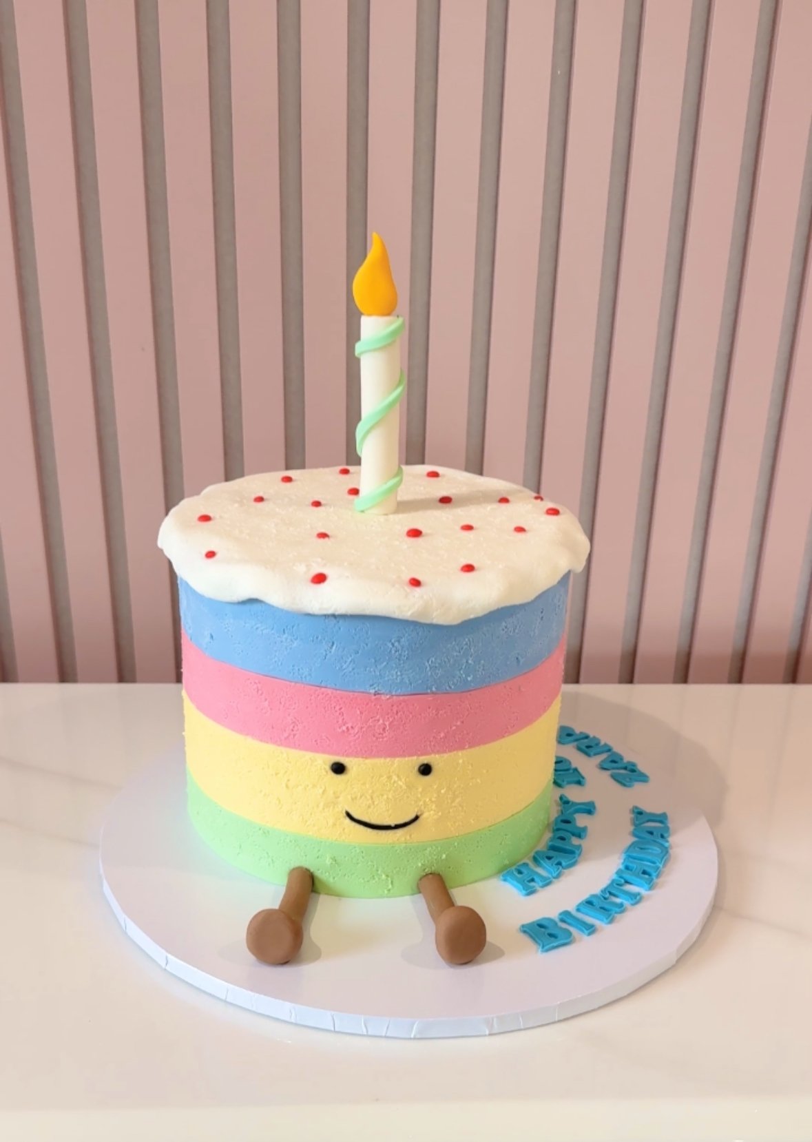 Bring the playful charm of Jellycat to the party with this adorable layer cake, inspired by the brand’s iconic soft toy style. Featuring pastel bands of blue, pink, yellow, and green buttercream, a cheerful smiling face, and little legs, this cake is topped with fluffy white icing, red polka dots, and a single striped candle for a picture-perfect finish. Ideal for a child’s birthday, it’s as cute as it is delicious.