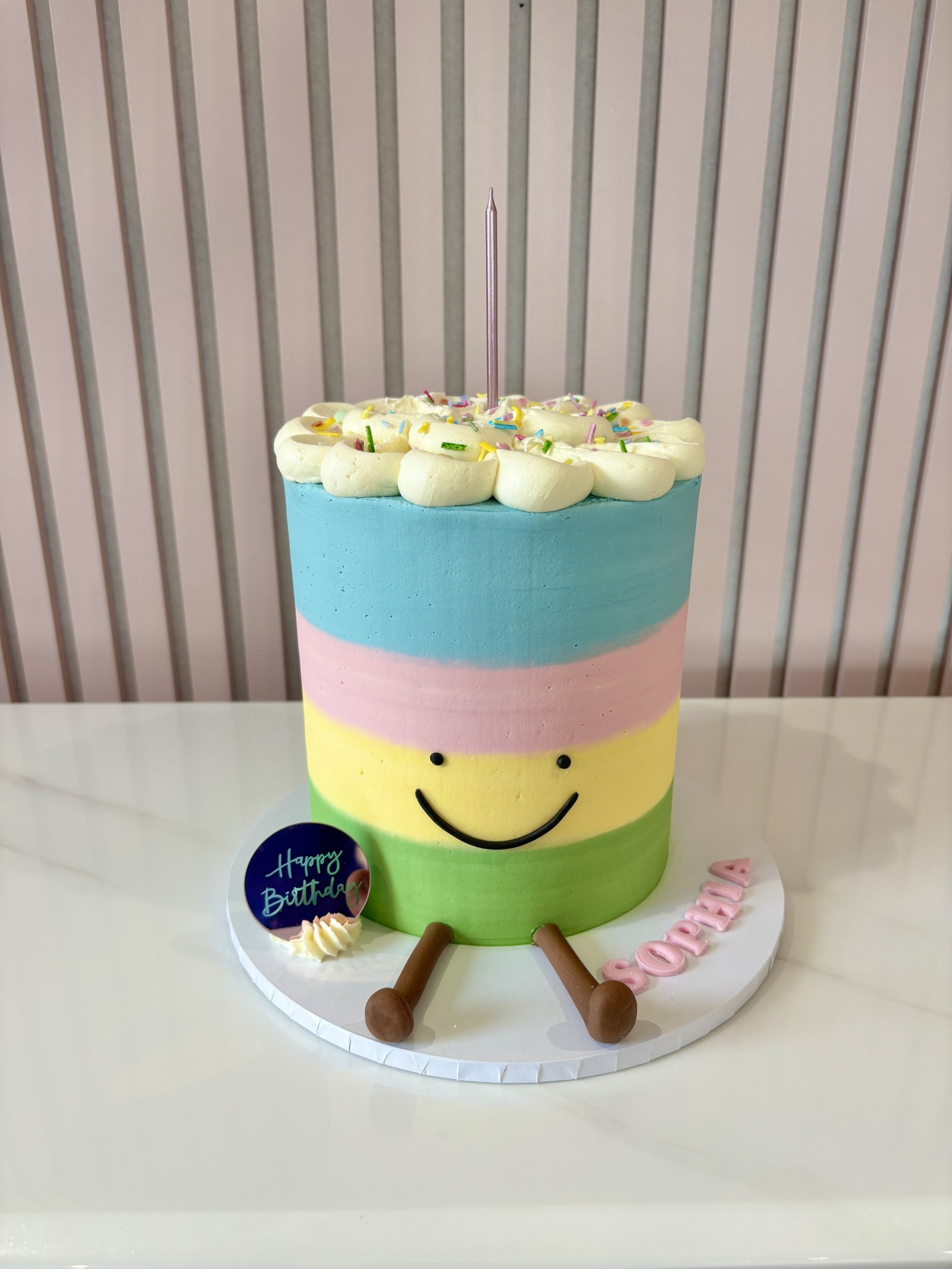 A playful and colourful Jellycat-inspired celebration cake featuring soft pastel rainbow buttercream stripes and a sweet smiling face design. Finished with fluffy piped buttercream on top, bright sprinkles and charming fondant legs, this design captures a fun, character-style look while keeping a clean, modern finish. Cheerful and full of personality, it makes a joyful centrepiece for children’s birthdays and colourful celebrations.
