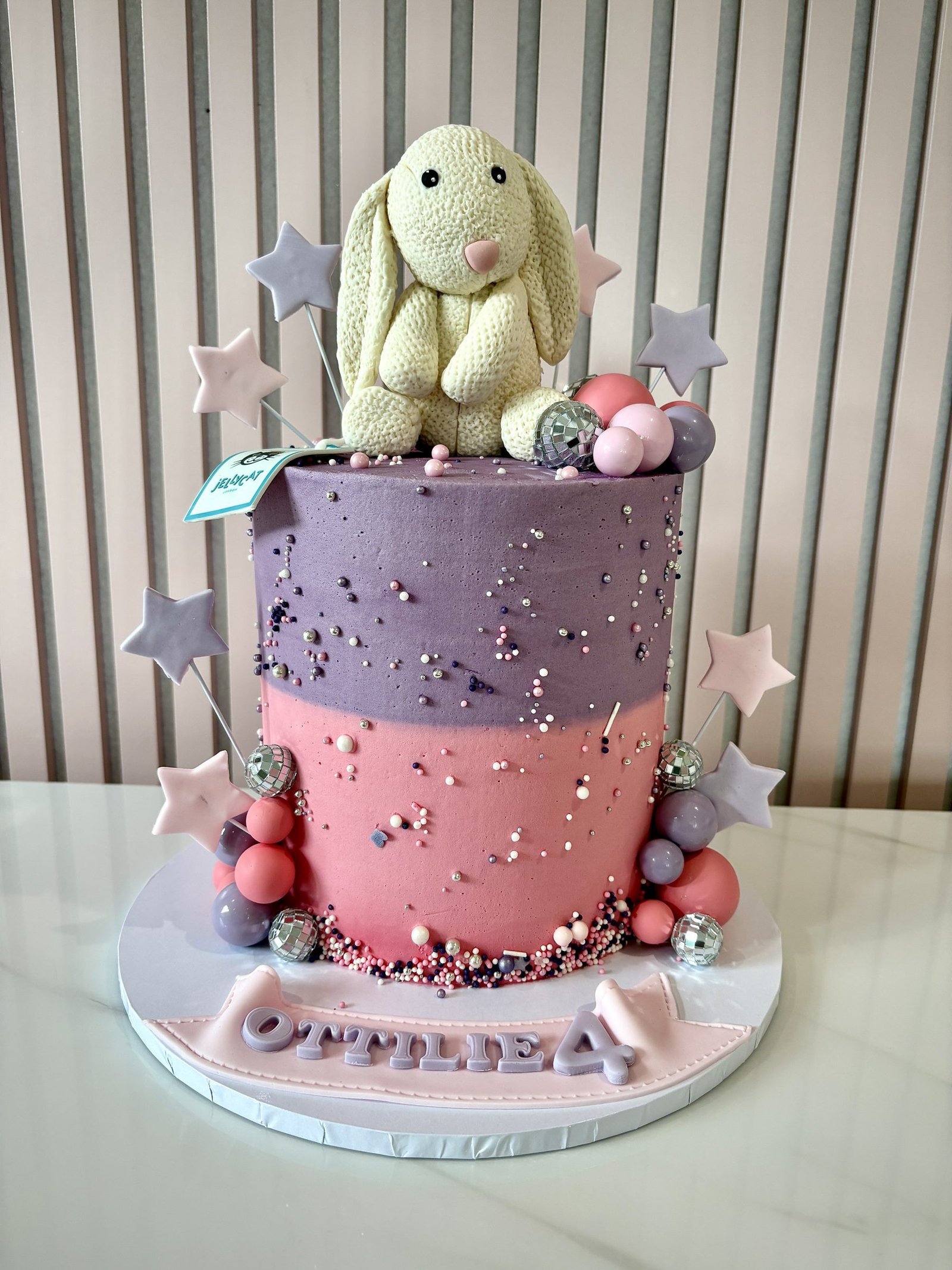 A beautifully crafted Jellycat-inspired cake, featuring a handmade fondant bunny styled after the beloved Bashful Bunny character. Finished in soft blush pink and lavender tones, the cake is decorated with a smooth buttercream finish, scattered sprinkles and delicate star toppers for a dreamy, playful look. Balloon-style spheres and subtle shimmer details add depth and texture, creating a design that feels both elegant and fun. The name on the base can be customised to suit your celebration, making this cake perfect for children’s birthdays and special occasions.