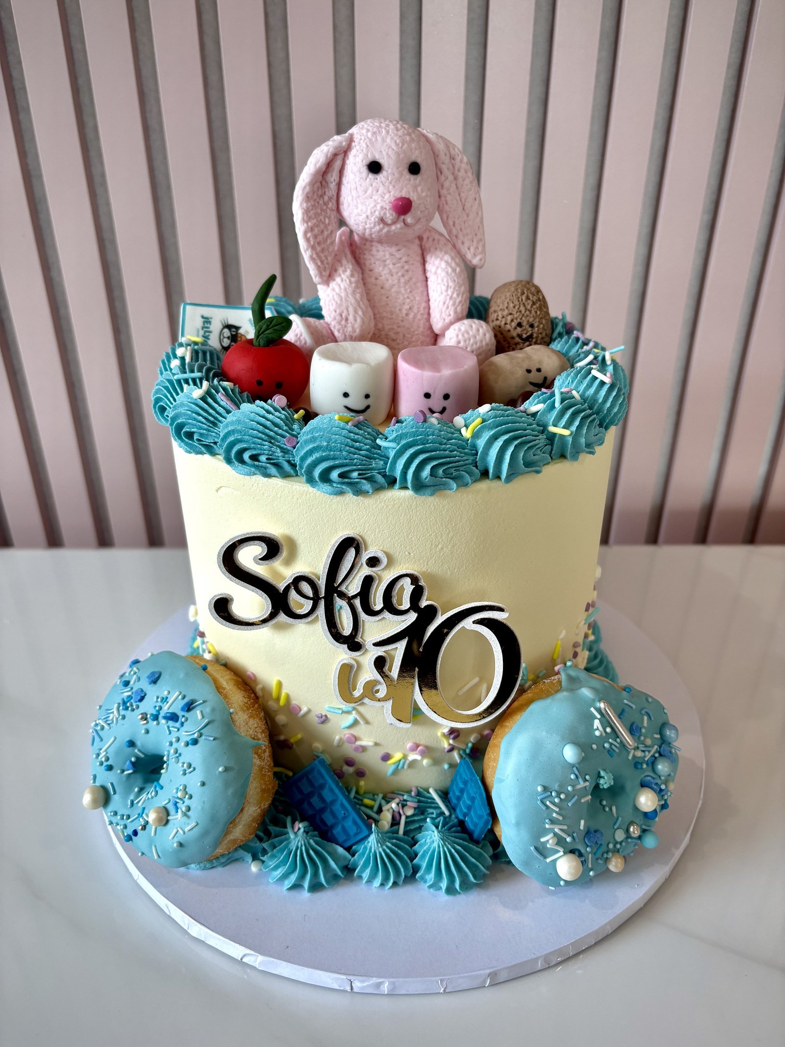 A cute and playful Jellycat themed birthday cake, perfect for little ones who love soft toy characters. The cake is finished in smooth buttercream with bright piped swirls and colourful sprinkles, creating a fun and cheerful design. On top, a selection of Jellycat-inspired characters are carefully handmade, including a bunny and sweet treat characters, bringing the cake to life with charming detail. Finished with decorative doughnuts and personalised name detailing, this cake makes a delightful centrepiece for a joyful children’s birthday celebration.