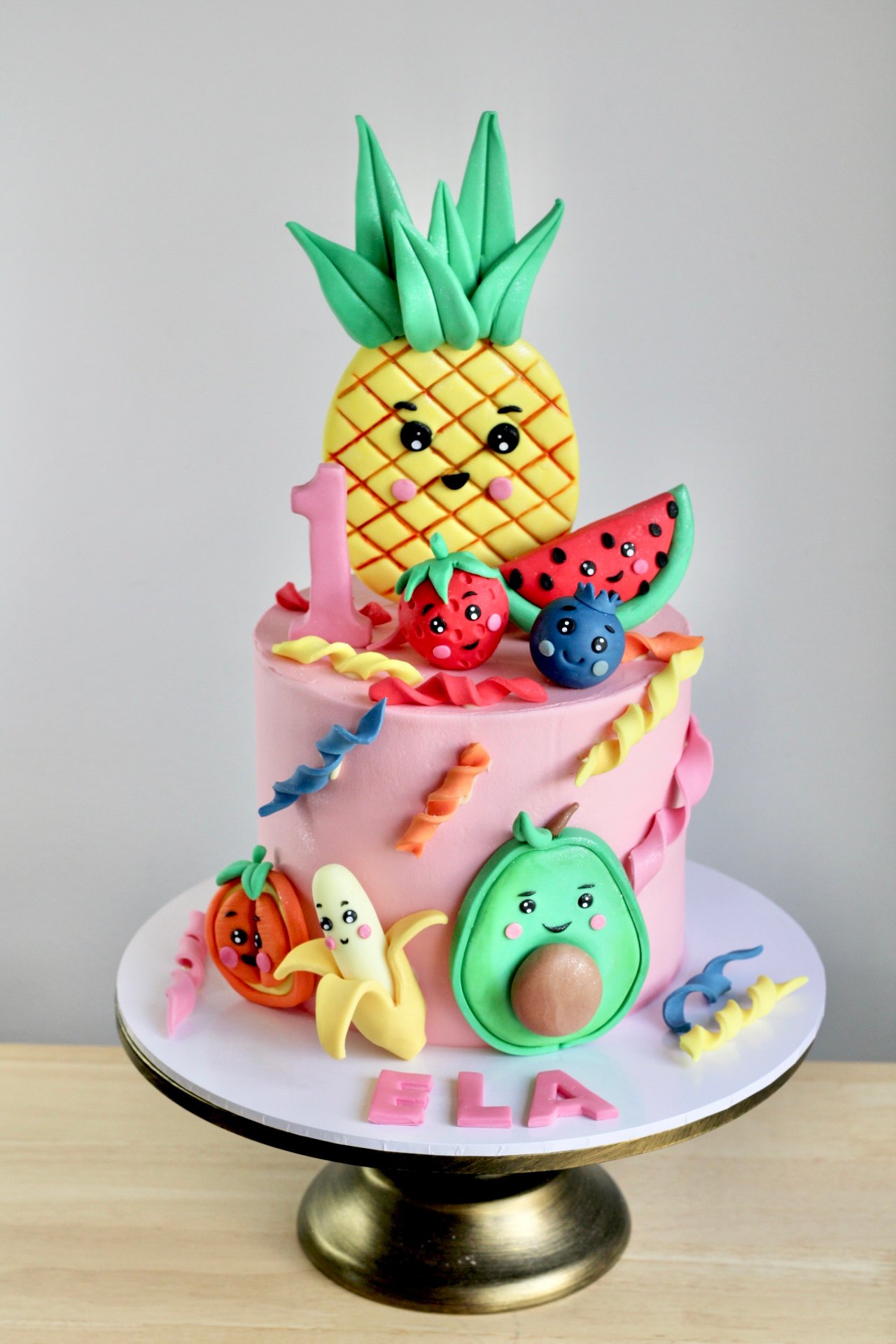 This adorable kawaii fruit-themed cake is a vibrant and cheerful choice for a fun-filled celebration! Decorated with a delightful selection of fondant fruits, including a smiling pineapple, watermelon, avocado, and more, this cake brings a playful touch to any party. The pastel pink base is accented with colourful fondant streamers, making it a joyful centrepiece for a birthday celebration.
