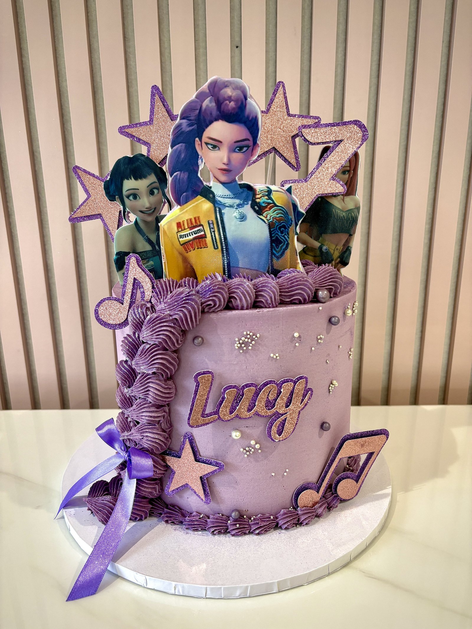 A bold and vibrant KPop Demon Hunters cake designed for fans who love music, performance and statement style. Finished in rich lilac buttercream with textured piping detail cascading down the side, this design is decorated with glitter stars, musical notes and striking character toppers to capture the high-energy stage aesthetic. Personalised with your chosen name and age, it creates a dramatic and eye-catching centrepiece perfect for K-pop–themed birthdays. Colour palettes and detailing can be tailored to suit your celebration while keeping the signature performance-inspired look.