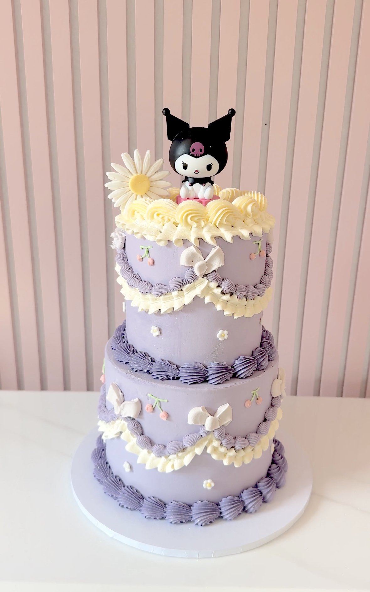 A show-stopping two-tier creation inspired by the mischievous charm of Kuromi. This pastel purple cake is decorated with playful vintage piped ruffles, dainty bows, and cute cherry details, all finished with a swirl of vanilla buttercream and a cheerful daisy. Topped with a Kuromi figurine, it’s the perfect choice for fans of Sanrio or anyone after a bold and fun birthday centrepiece.