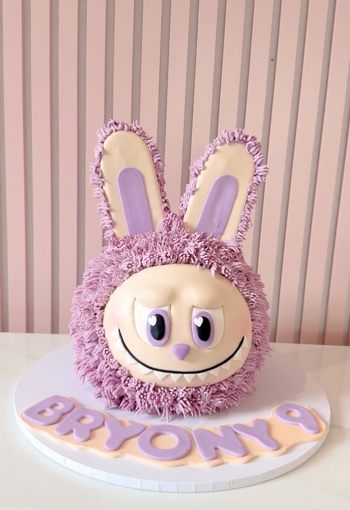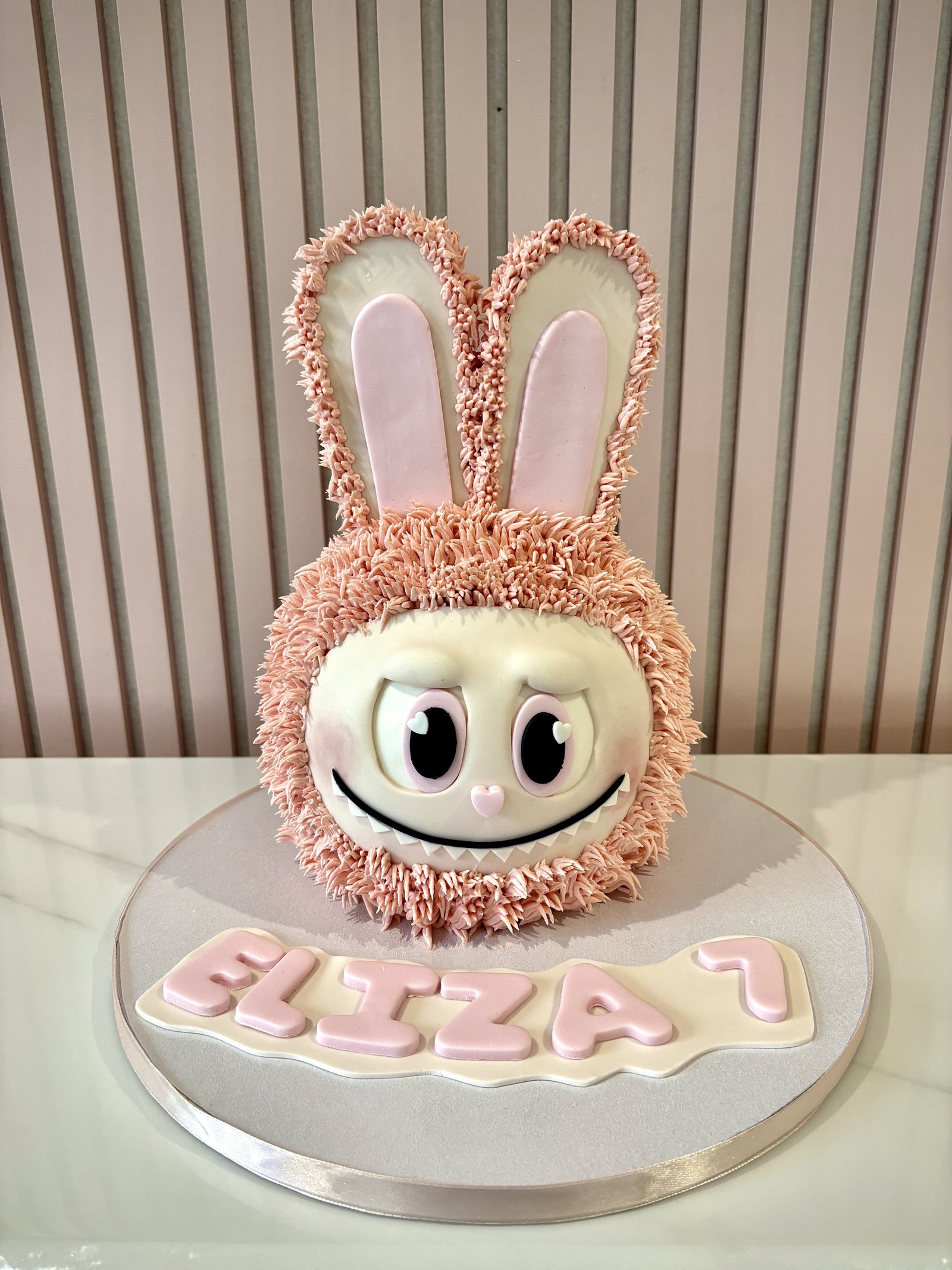 This Labubu-inspired cake features a bold sculpted character design with textured detailing and playful expression, creating a striking and memorable centrepiece. Finished in soft pastel tones, the cake has a fun yet polished look that stands out while still feeling cute and character-led. A personalised name plaque completes the design.