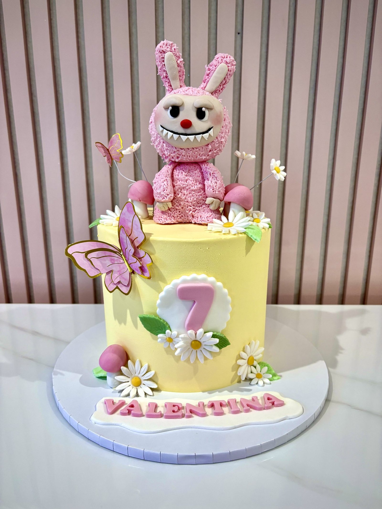 This playful Labubu-inspired cake features a hand-crafted character topper with textured detailing, set against a soft pastel base for a whimsical finish. Decorated with delicate florals, butterflies, and mushroom accents, the design has a charming, storybook feel while remaining bold and eye-catching. A statement number plaque and personalised name complete the cake, making it a standout centrepiece. The design can be customised for any age, colour palette, or name.