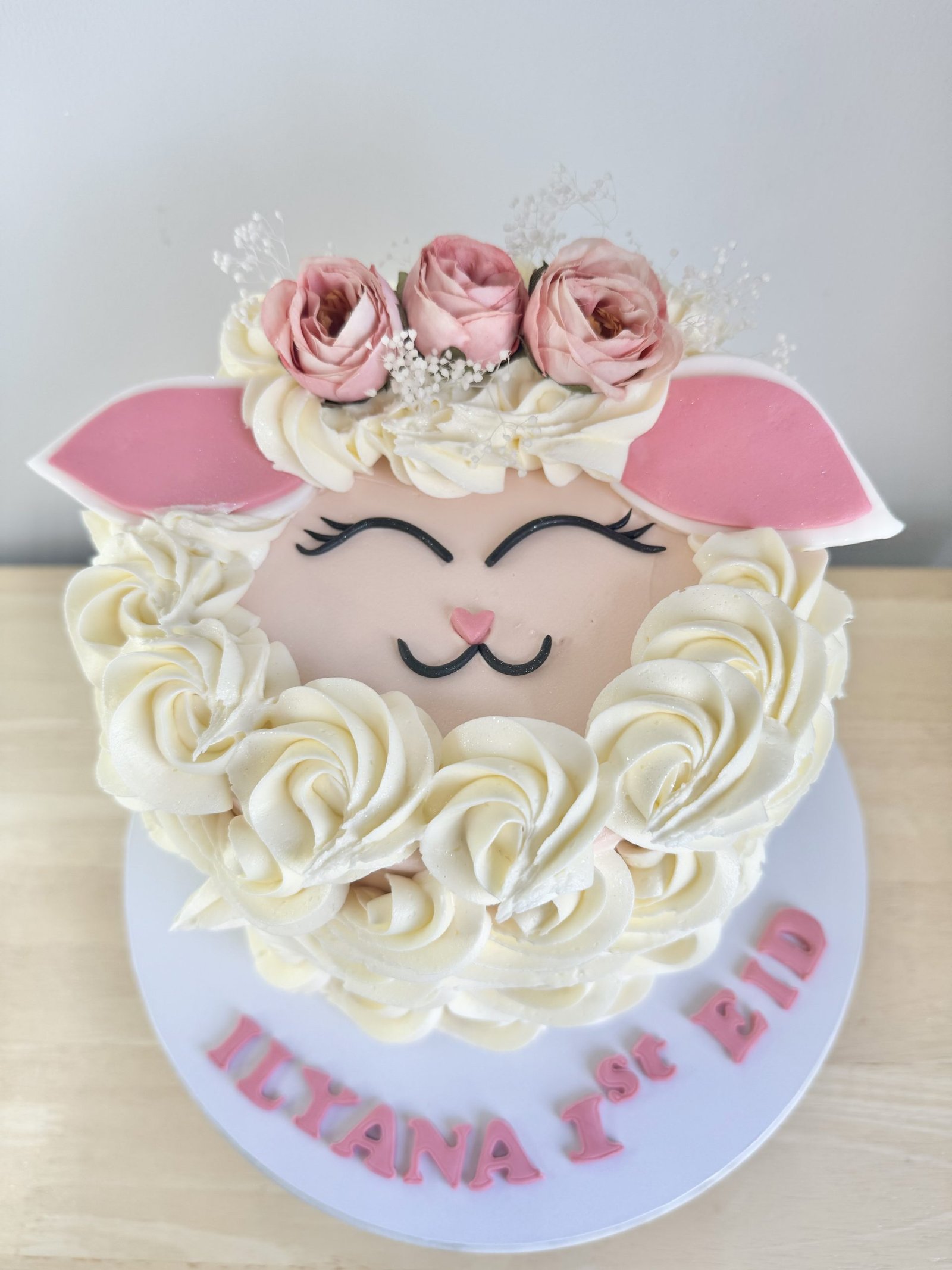 Celebrate in the sweetest way with this Lamb Cake an adorable centrepiece perfect for special occasions. Designed to resemble a charming lamb, this cake features beautifully piped buttercream swirls to create its fluffy coat, with delicate artificial flowers adding a touch of elegance. With its soft pink ears and a happy, smiling face, this cake is ideal for birthdays or any joyous gathering.