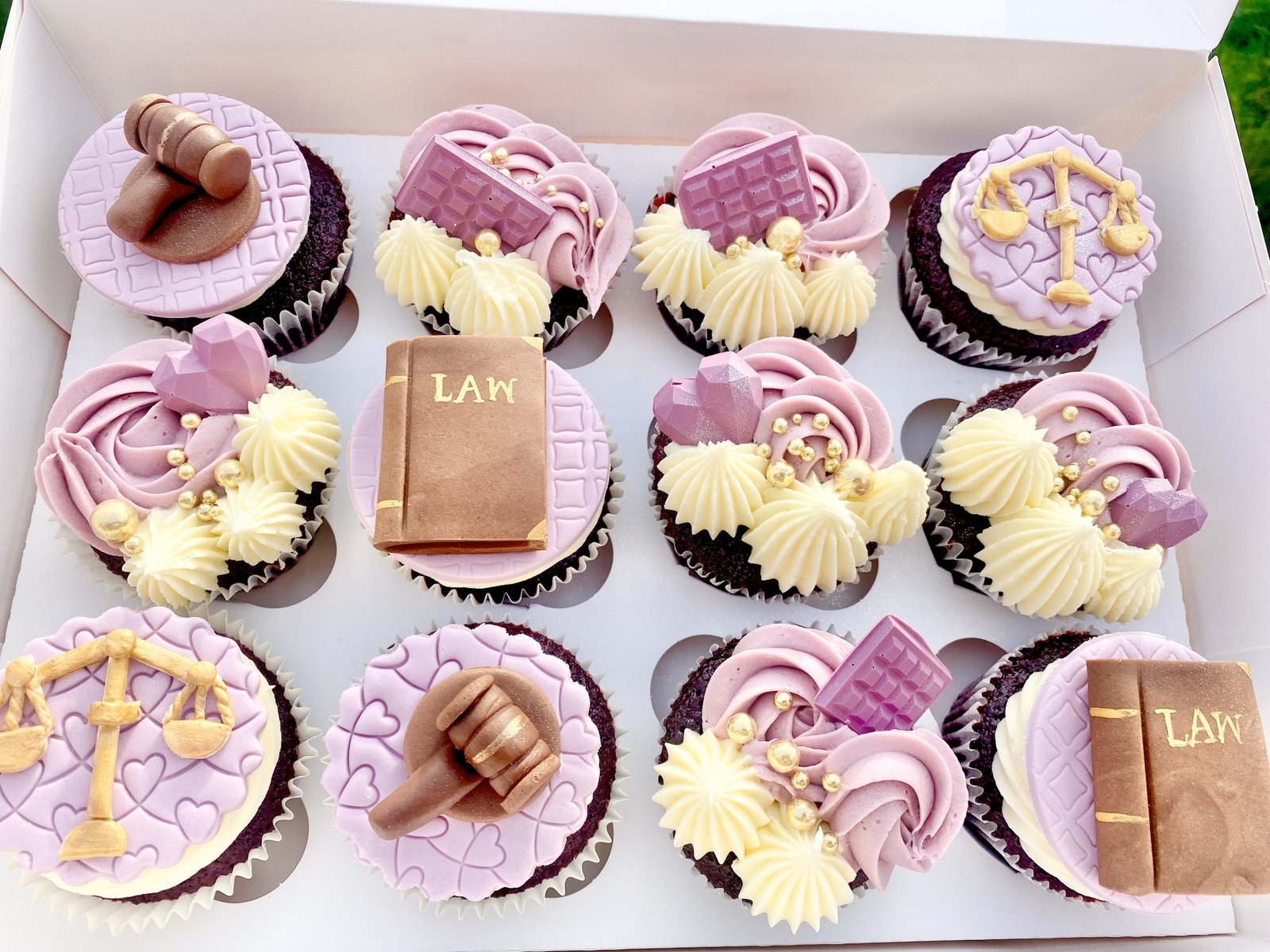 These elegant law graduation cupcakes are finished with soft lilac and cream buttercream swirls, detailed with refined fondant toppers including law books, scales of justice, gavels and geometric accents. Designed to feel celebratory yet polished, they’re a perfect choice for marking a law graduation, qualification or academic achievement with a sophisticated, carefully crafted finish.