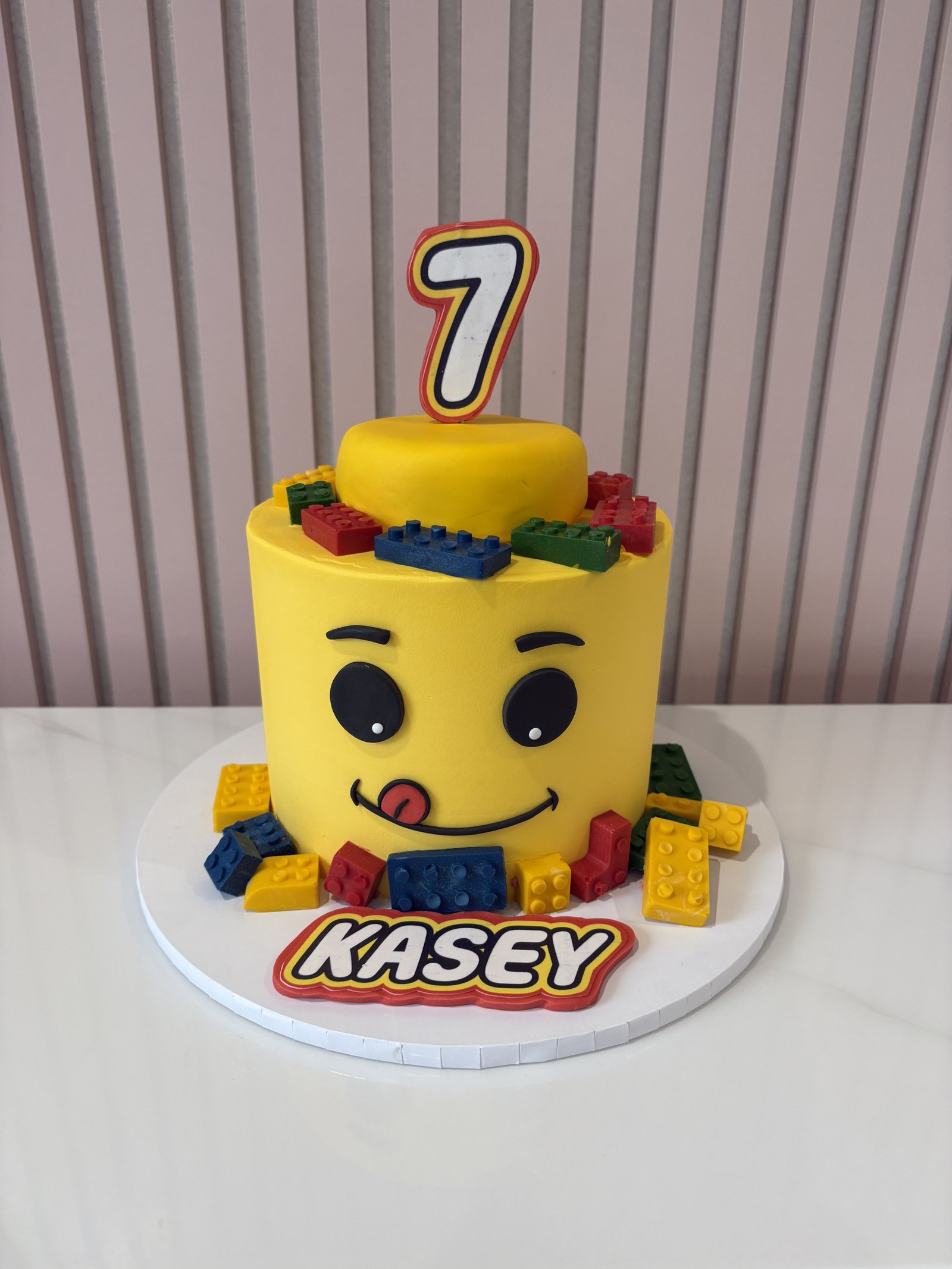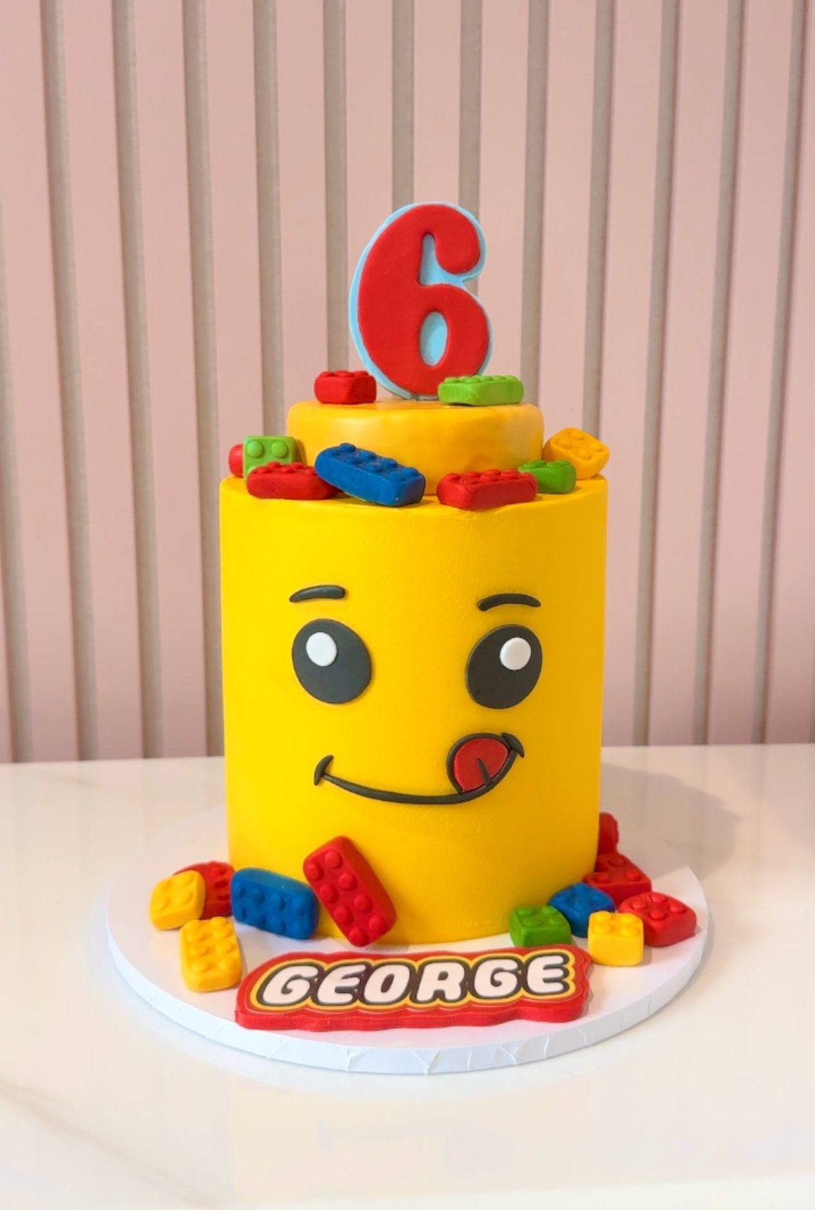 This bright and playful Lego-inspired cake is perfect for mini master builders! Featuring a cheerful yellow character face and colourful edible building bricks, it’s a fun and creative way to celebrate any child’s birthday.